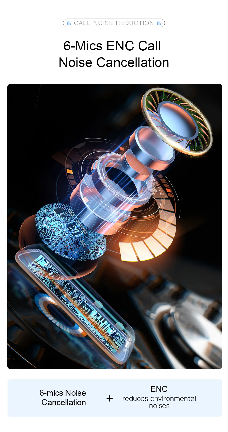 [Cancelación de ruido de llamada de 6 micrófonos ENC]-Con 6 micrófonos y ENC, puede manejar el sonido ambiental y las voces humanas de una manera más precisa, siga hablando donde quiera que esté.