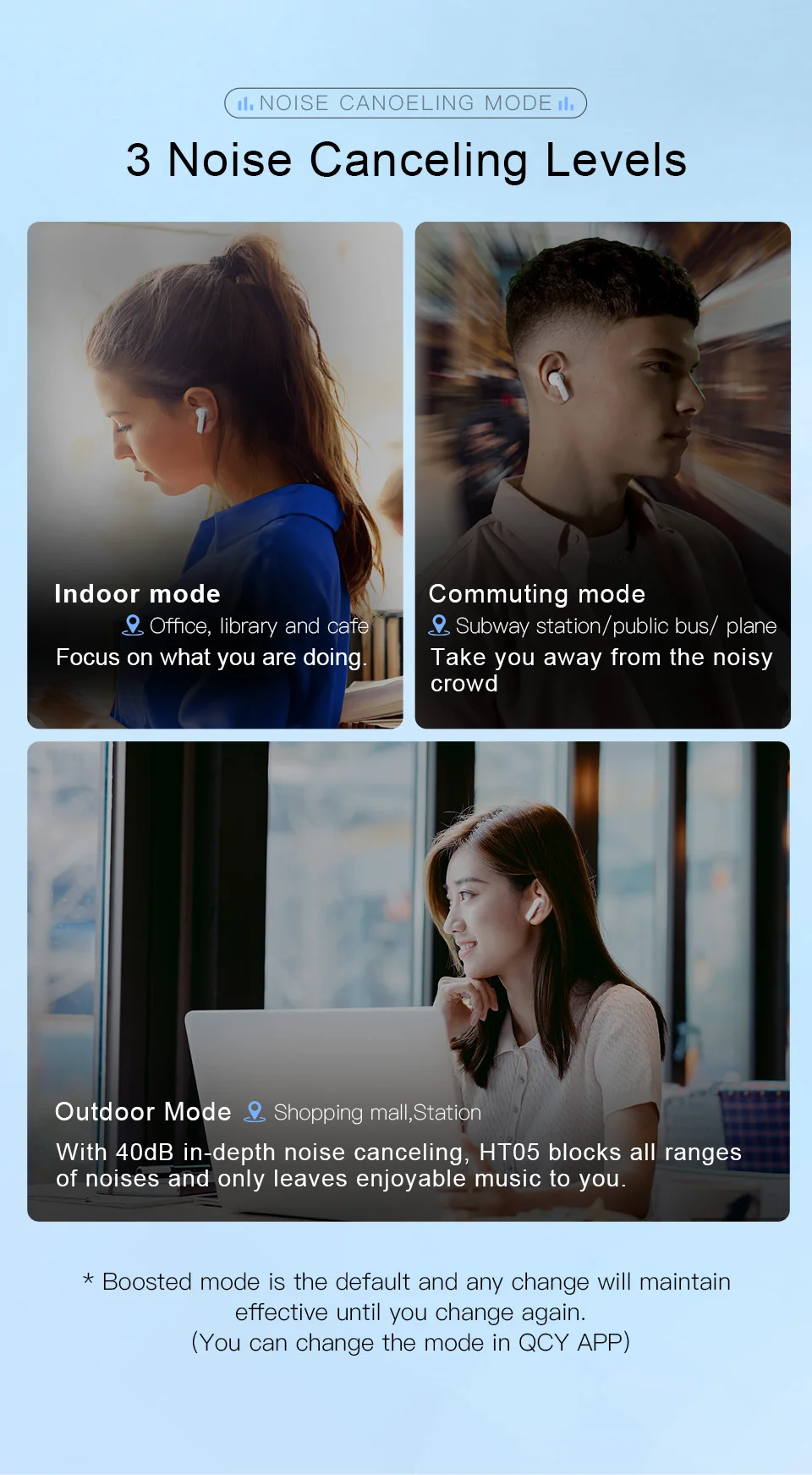 QCY HT05 ANC Auriculares inalámbricos 40dB Cancelación activa de ruido Auriculares 6 Mic ENC HD Call TWS BT5.2 Auriculares Modo de transparencia[Cancelación de ruido ANC híbrida de 40dB]-Cancelación de ruido adaptativa, el sonido ambiental desaparece para dejarte con nada más que sonido puro.