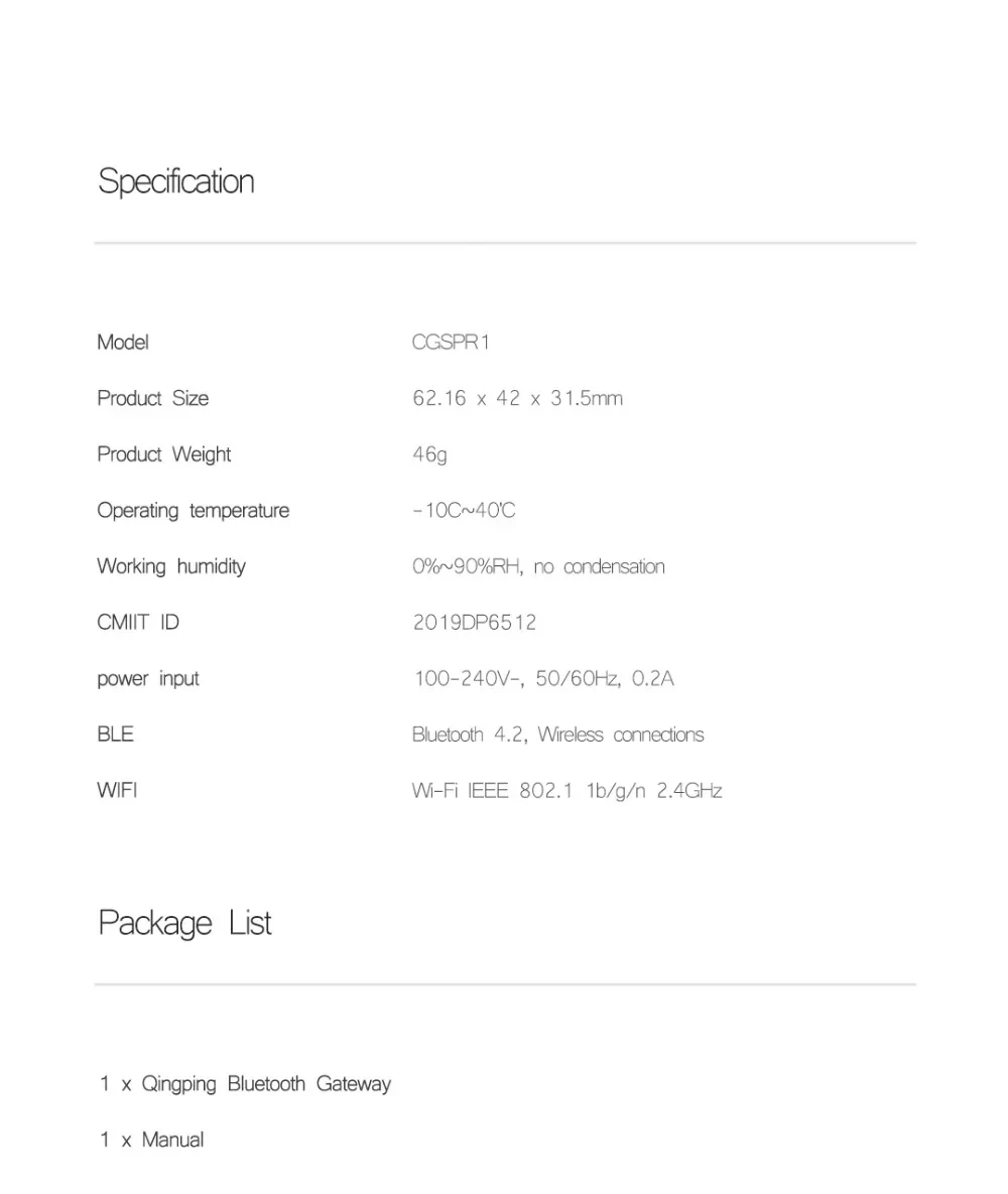 Modelo: CGSPR1Tamaño del producto: 62,16 x 42 x 31,5 mmPeso del producto: 46 gTemperatura de funcionamiento: -10C~40'CHumedad de trabajo: 0%~90%RH, sin condensaciónID de CMIIT: 2019DP6512Entrada de energía: 100-240V-, 50/60Hz, 0,02ABT 4.2, conexiones inalámbricasWi-Fi IEEE 802.1 1b/g/n 2,4GHzEstándar ejecutivo: GB 17625.1-2012, GB 4943.1-2011, GB/T 9254-2008
