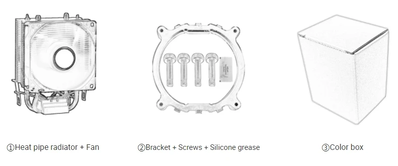 Paquete: Caja de color (refrigerador de CPU*1, soporte de fijación*1 kit, grasa de silicona*1)