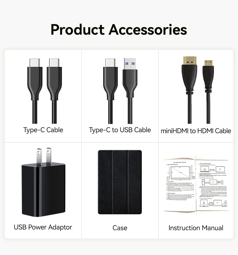 Monitor portátil/Cable de 1/2/Cable de 1/1/Cable HDMI/Adaptador de corriente/Manual de usuario/Cubierta protectora