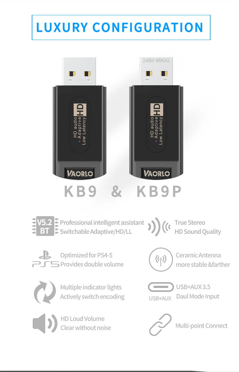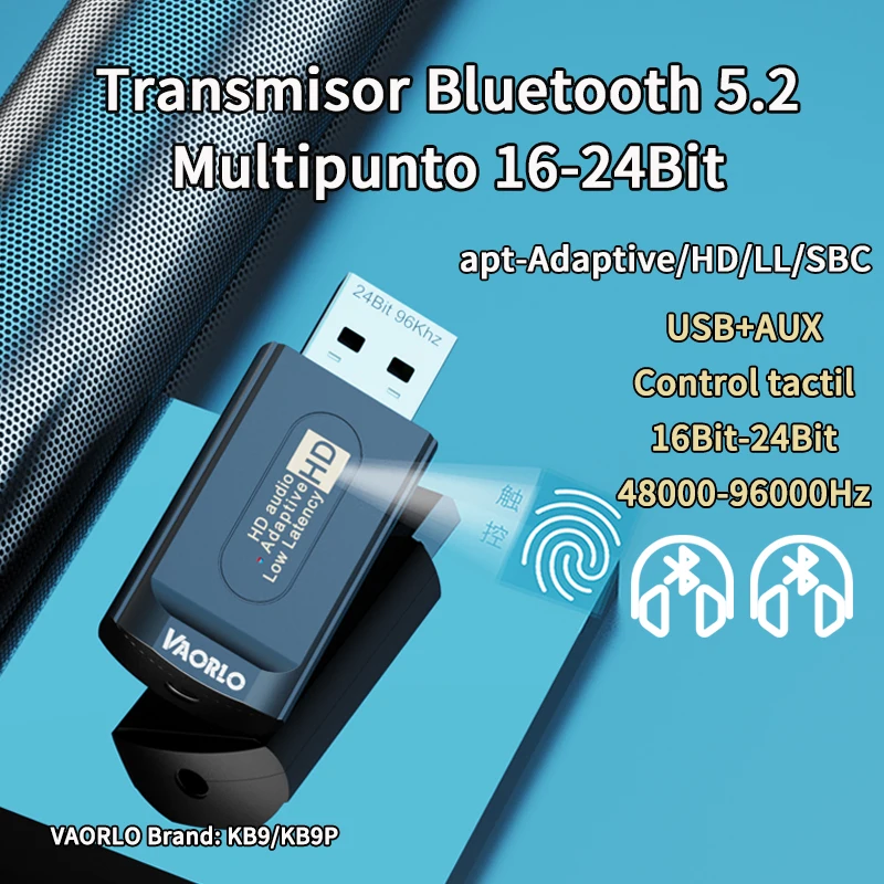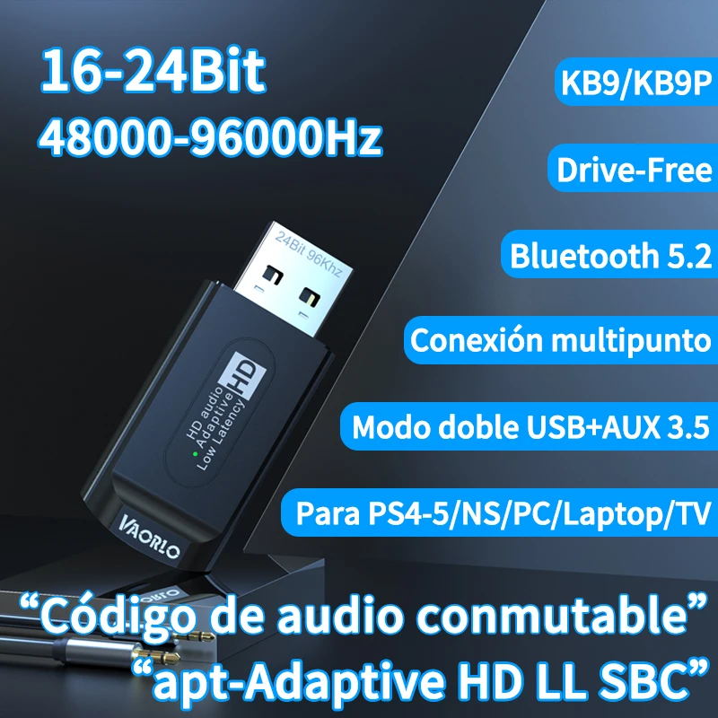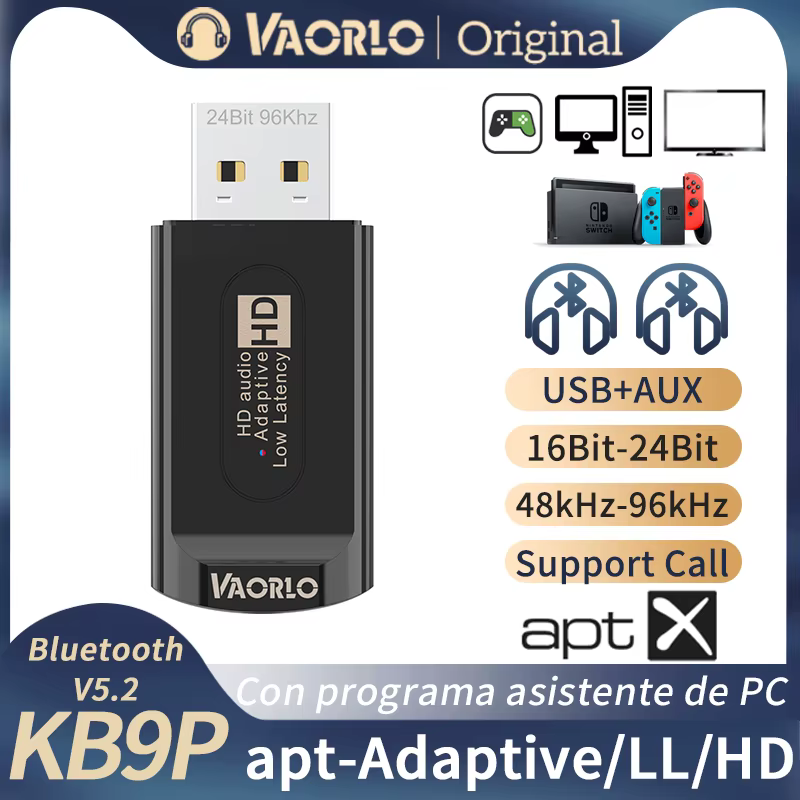 Comprar Qualcomm KB9P-transmisor de Audio con Bluetooth 5,2, adaptable multipunto adaptador inalámbrico aptX-Adaptive/LL/HD, 24 bits, AUX + USB, para TV, portátil, PC, Switch, PS4/5,Con programa asistente de PC