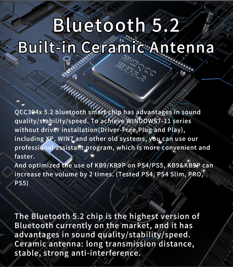----- Chip Bluetooth 5,2, baja latencia de 40ms, 600/kbps;