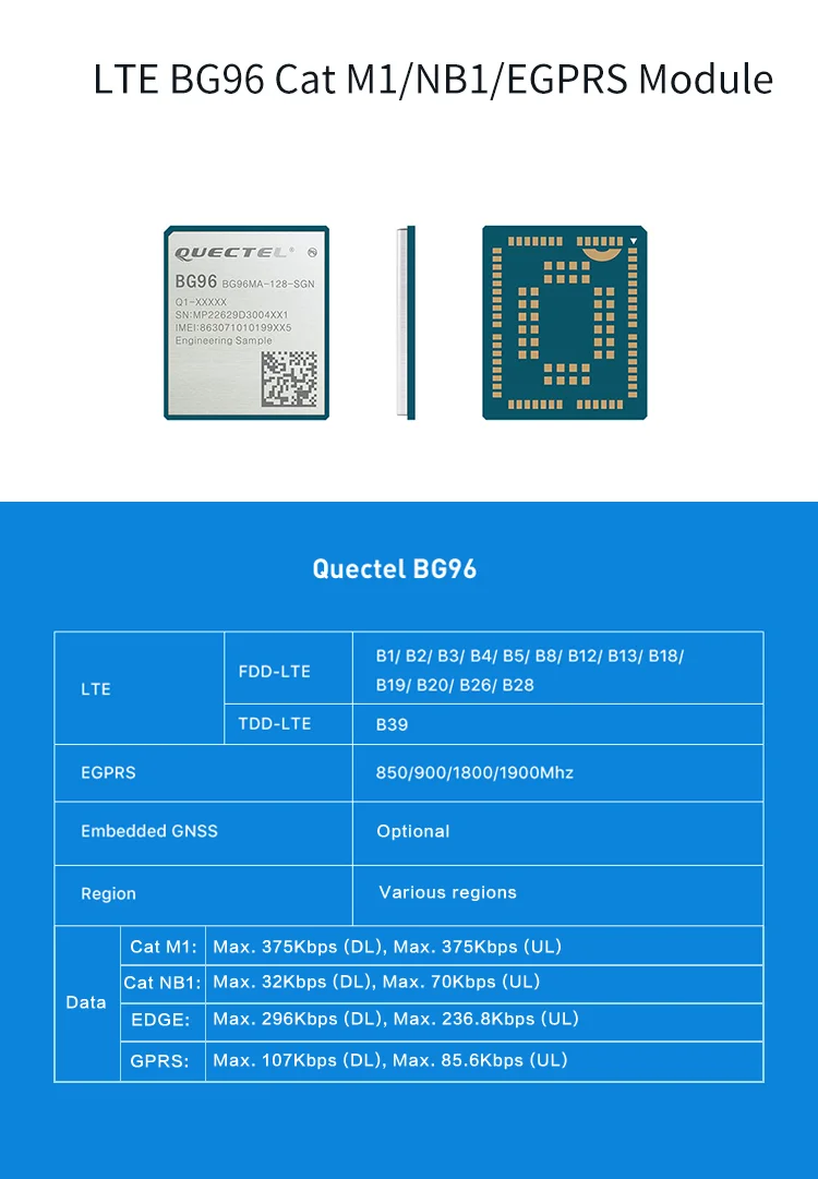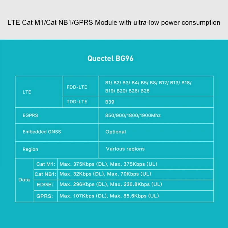 BG96 es una serie de módulos LTE Cat M1/Cat NB1/EGPRS que ofrece velocidades de datos máximas de 375Kbps de enlace descendente y 375Kbps de enlace ascendente. Cuenta con bandas de frecuencia globales, consumo de energía ultra bajo y proporciona compatibilidad PIN a pin con el módulo estándar Quectel LTE EG91/EG95, módulo LPWA/BG95, módulo UMTS/HSPA UG95/UG96 y módulo GSM/GPRS M95.
