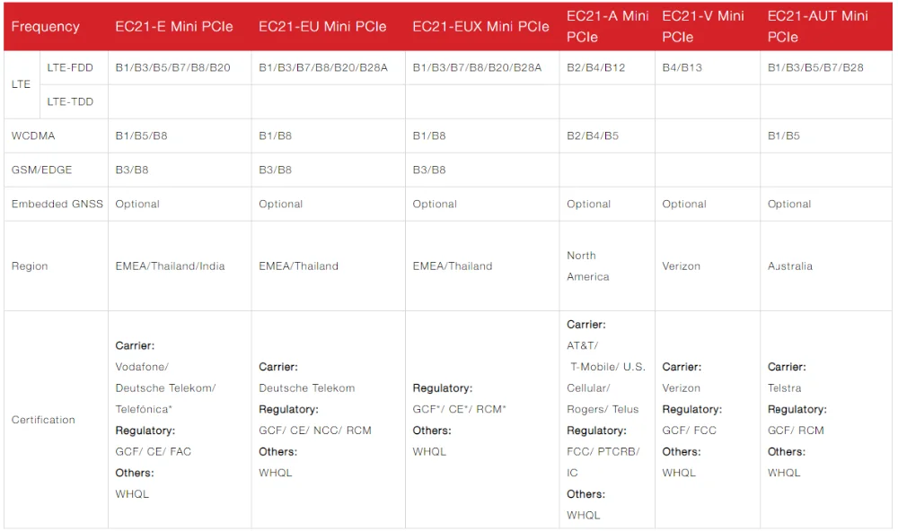 EC21 Mini PCIe contiene 10 variantes: EC21-E Mini PCIe, EC21-EU Mini PCIe, EC21-EUX Mini PCIe, EC21-A Mini PCIe, EC21-V Mini PCIe, EC21-AUT Mini PCIe, EC21-AU Mini PCIe, EC21-AUX Mini PCIe, EC21-KL Mini PCIe y EC21-J Mini PCIe.Esto lo hace compatible con versiones anteriores de las redes EDGE y GSM/GPRS existentes, lo que garantiza que pueda migrar fácilmente desde la red LTE a la red 2G o 3G.