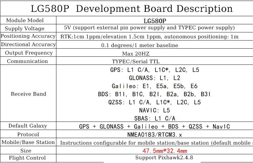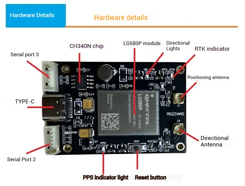 El módulo RTK utiliza el módulo LG580P recientemente lanzado de Quectel.Este módulo es principalmente un módulo RTK de banda completa.Lo más importante es que admite funciones de posicionamiento y orientación, que pueden satisfacer las necesidades de la mayoría de los usuarios en ángulos de dirección.La precisión de la orientación puede alcanzar los 0,1 grados.Se puede configurar libremente como modo de estación móvil o de estación base.Puede recibir todos los datos de la banda de frecuencia satélite en el mundo, buscar más rápido y obtener mejores resultados.La frecuencia de salida puede alcanzar hasta 20 HZ.La precisión fija RTK puede alcanzar 0,8 cm + 1 ppm y la precisión de elevación puede alcanzar 1,5 cm + 1 ppm.Puede cumplir con las aplicaciones relacionadas con la topografía, el mapeo y la navegación de drones.LG580P actualmente tiene 3 puertos serie independientes para satisfacer las necesidades de uso del puerto serie de los usuarios en diferentes ocasiones.Ya no te preocupes por el cableado, muy flexible.Esta placa admite depuración USB y desarrollo de depuración de puerto serie externo, y también puede personalizar las funciones de hardware según las necesidades del usuario.Proporcionamos software de computadora host, que permite a los usuarios utilizar el software de computadora host con una cuenta CORS para lograr la fijación RTK.La precisión de posicionamiento puede alcanzar el nivel centímetrico.Además, desarrollaremos la versión 4G y la versión LORA en el futuro, que pueden satisfacer las necesidades de los usuarios para utilizar la función RTK de forma remota.Brindaremos soporte técnico para los usuarios que utilicen nuestra placa de desarrollo, lo que ayudará a los usuarios a realizar el desarrollo RTK.
