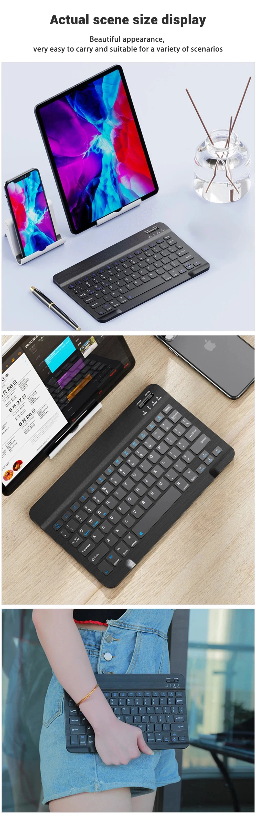 Hay tres tamaños diferentes para elegir el teclado Bluetooth, el teclado de 7 pulgadas mide 20 cm de largo y 12,5 cm de ancho, y el teclado de 10 pulgadas mide 25 cm de largo y 15 cm de ancho.