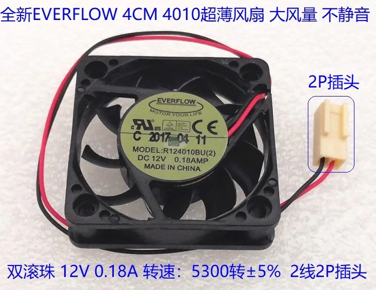 A estrenar y original para everflow 4CM 4010 ventilador ultradelgado velocidad máxima de flujo de aire Dentro de la apertura 3,2 MM es un contrapunto de doble cara (fuera de la apertura 4,2 MM) profundidad del contrapunto 2. 5MM para evitar la cabeza sobre el ventilador 2 cables 2510-P general 2P Parámetros básicos Marca: everflow Modelo: R124010BU(2) Tamaño: 40 MM x 40 MM 10. 80MM Distancia del agujero del corazón 51MM Rodamientos: doble bola Velocidad de rotación: 5300 rpm ± 5% volumen de aire no silencioso Voltaje: 12V CC Corriente: 0,18 a medida alrededor de 0,15 a Cableado: 2 cables 2510-Putong 2p
