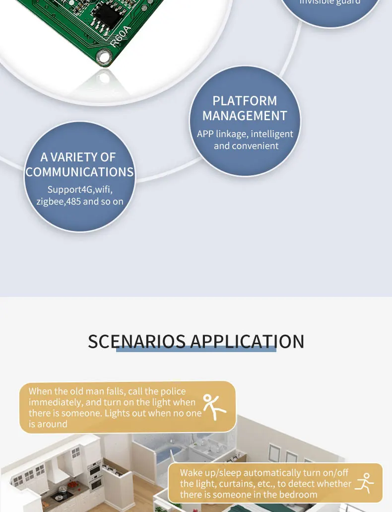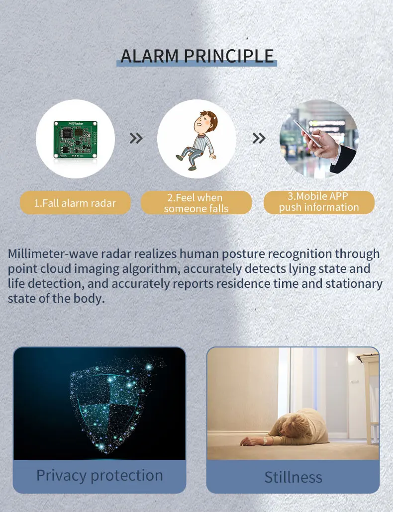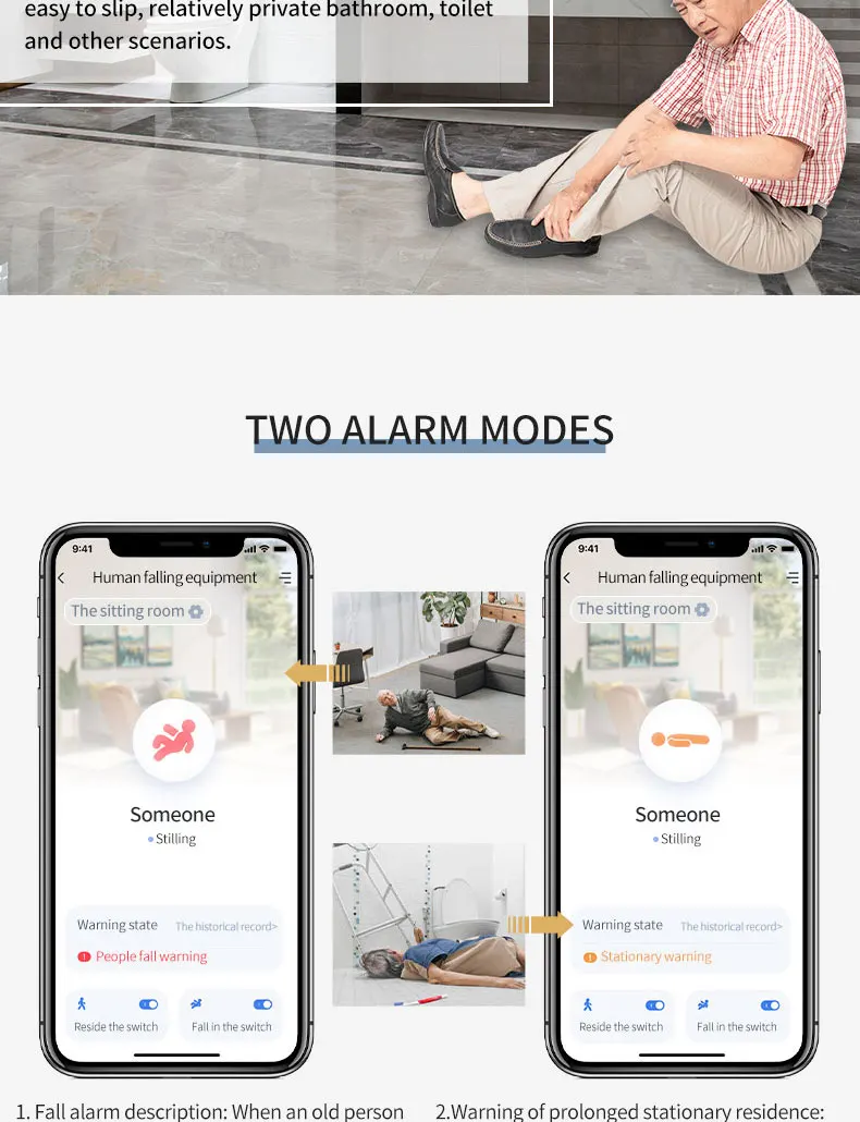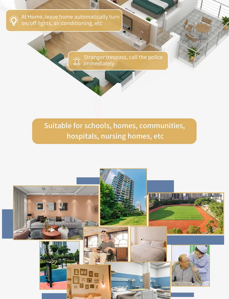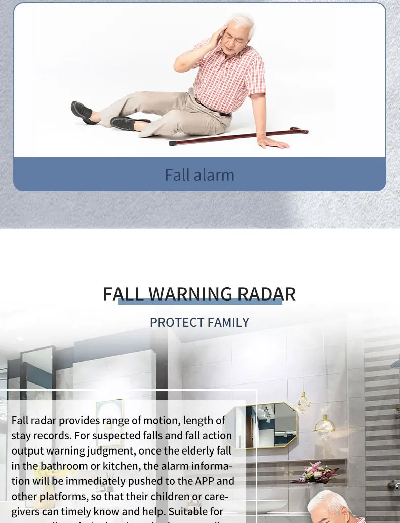 El radar de caída proporciona amplitud de movimiento y registros de duración.Para recibir caídas sospechosas y caídas, advertencia de salida activa, una vez que las personas mayores caigan en el baño o la cocina, la información de la alarma se enviará inmediatamente a la APLICACIÓN y otras plataformas, para que sus hijos o cuidadores puedan conocer y ayudar oportunamente.Adecuado para fácil deslizamiento, baño relativamente privado, inodoro y otros escenarios.
