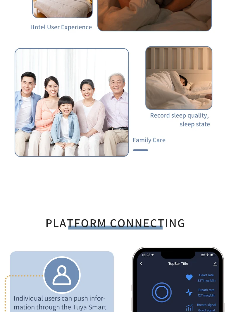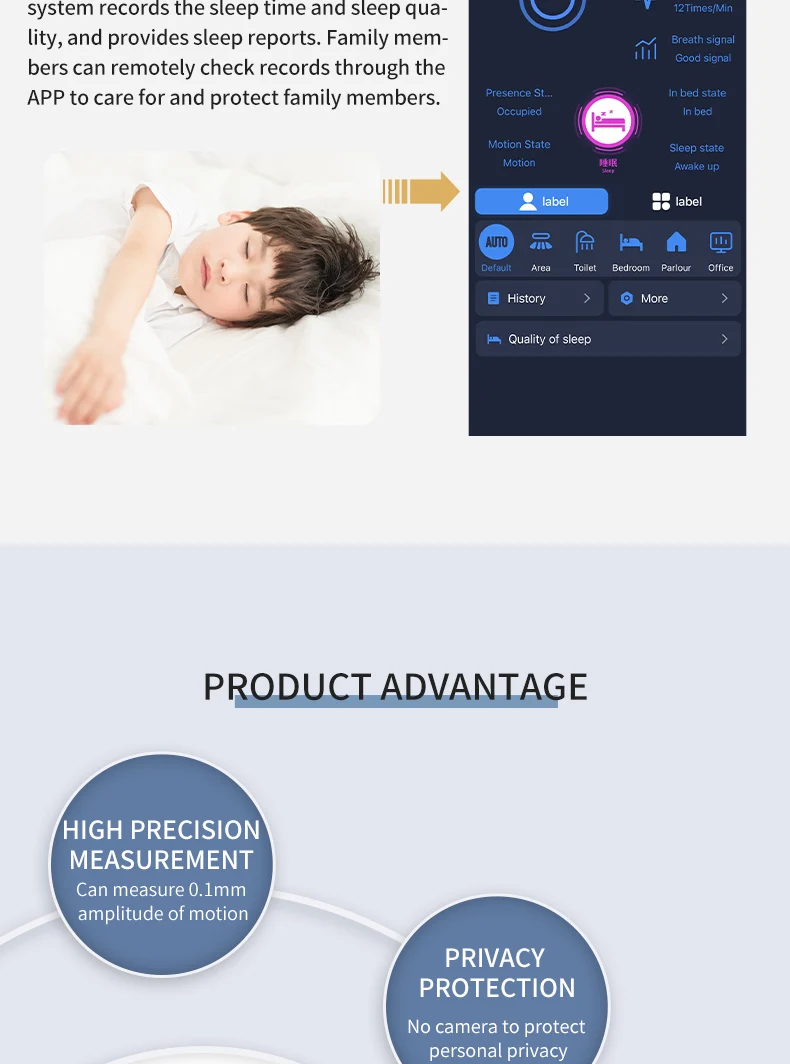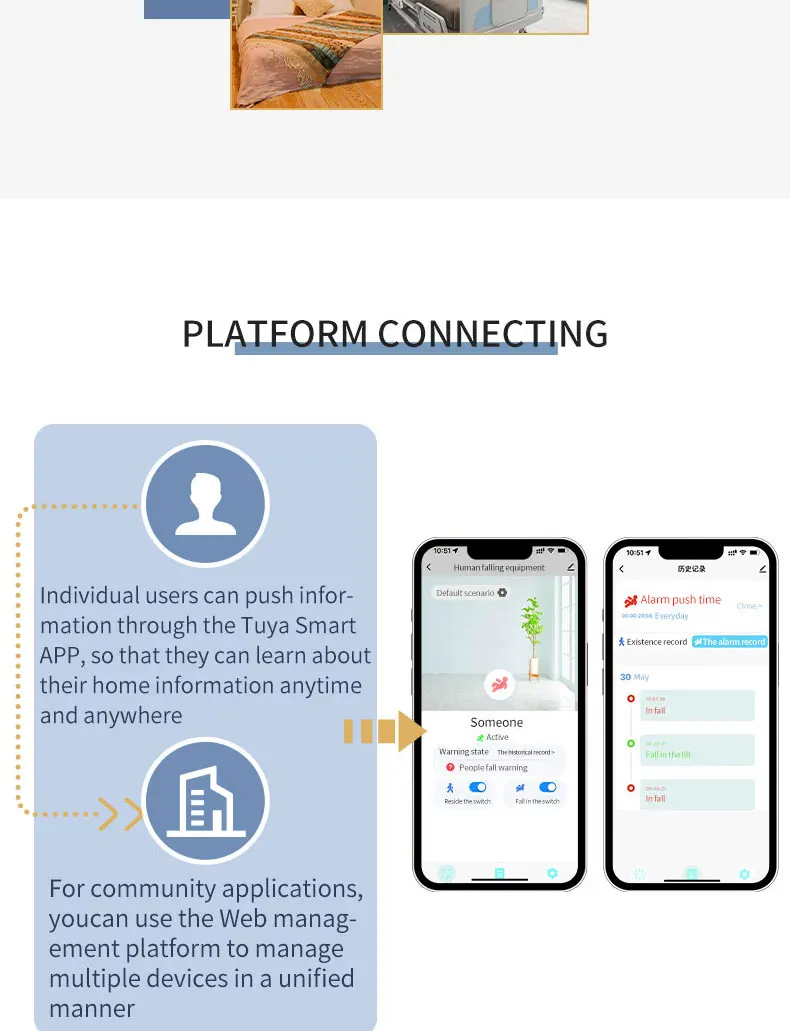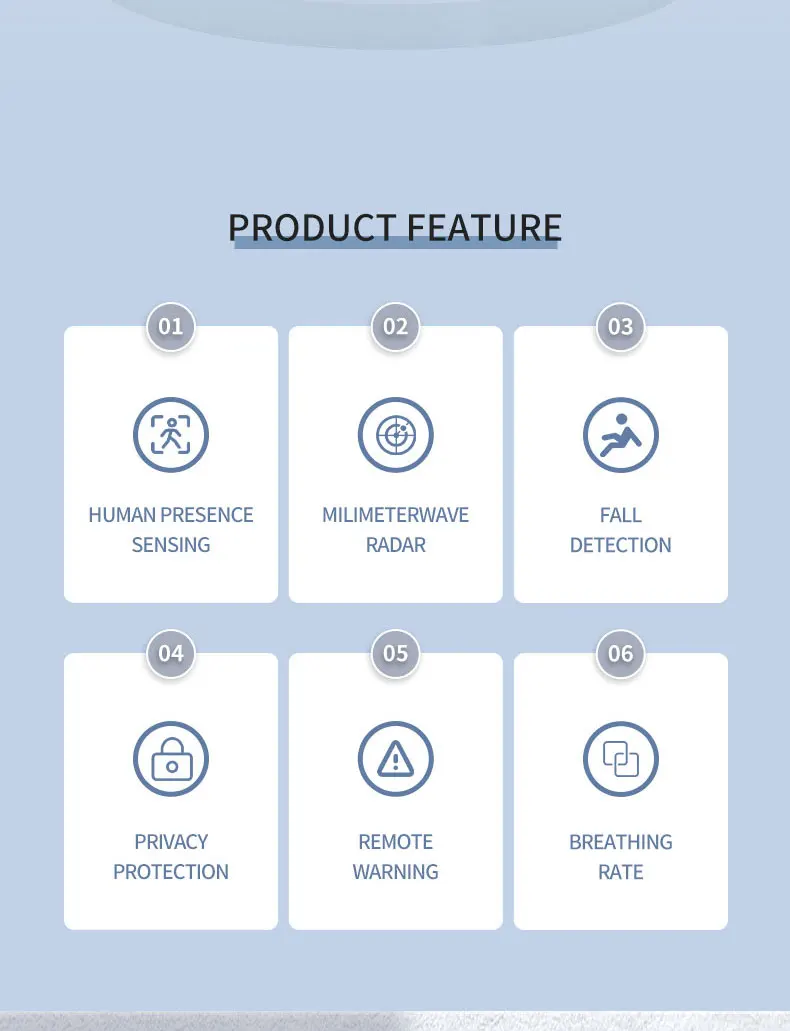 El radar de caída proporciona amplitud de movimiento y registros de duración.Para recibir caídas sospechosas y caídas, advertencia de salida activa, una vez que las personas mayores caigan en el baño o la cocina, la información de la alarma se enviará inmediatamente a la APLICACIÓN y otras plataformas, para que sus hijos o cuidadores puedan conocer y ayudar oportunamente.Adecuado para fácil deslizamiento, baño relativamente privado, inodoro y otros escenarios.