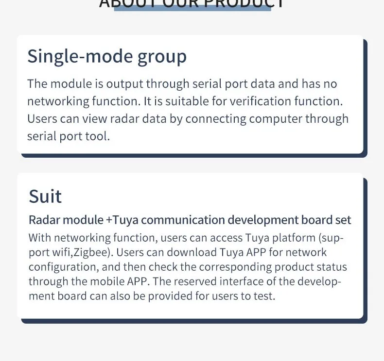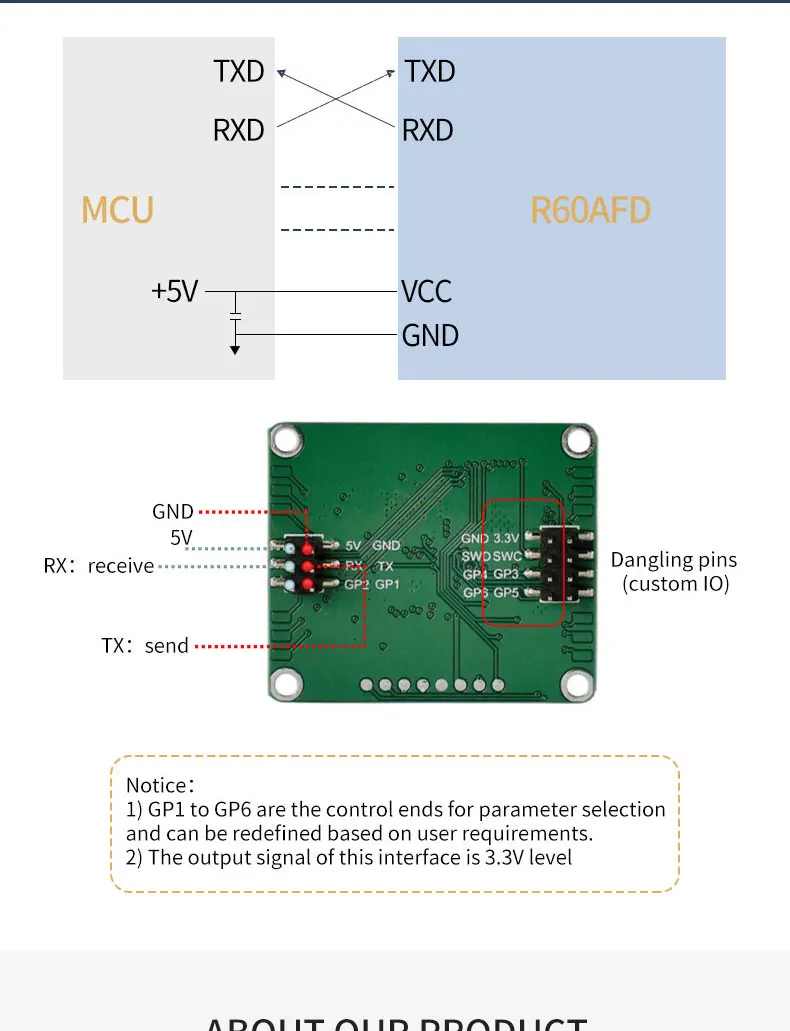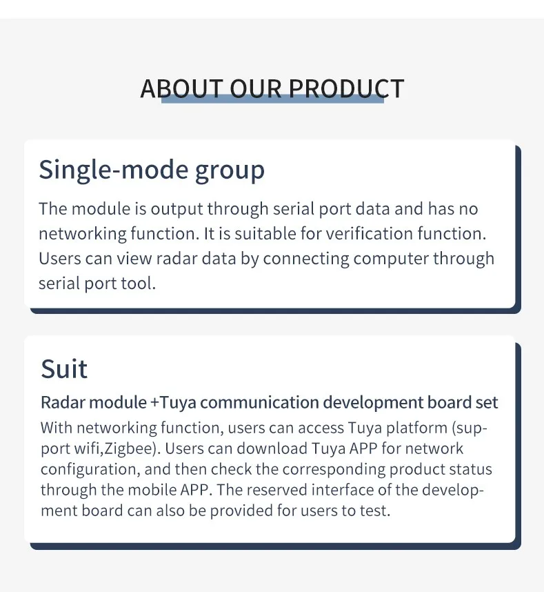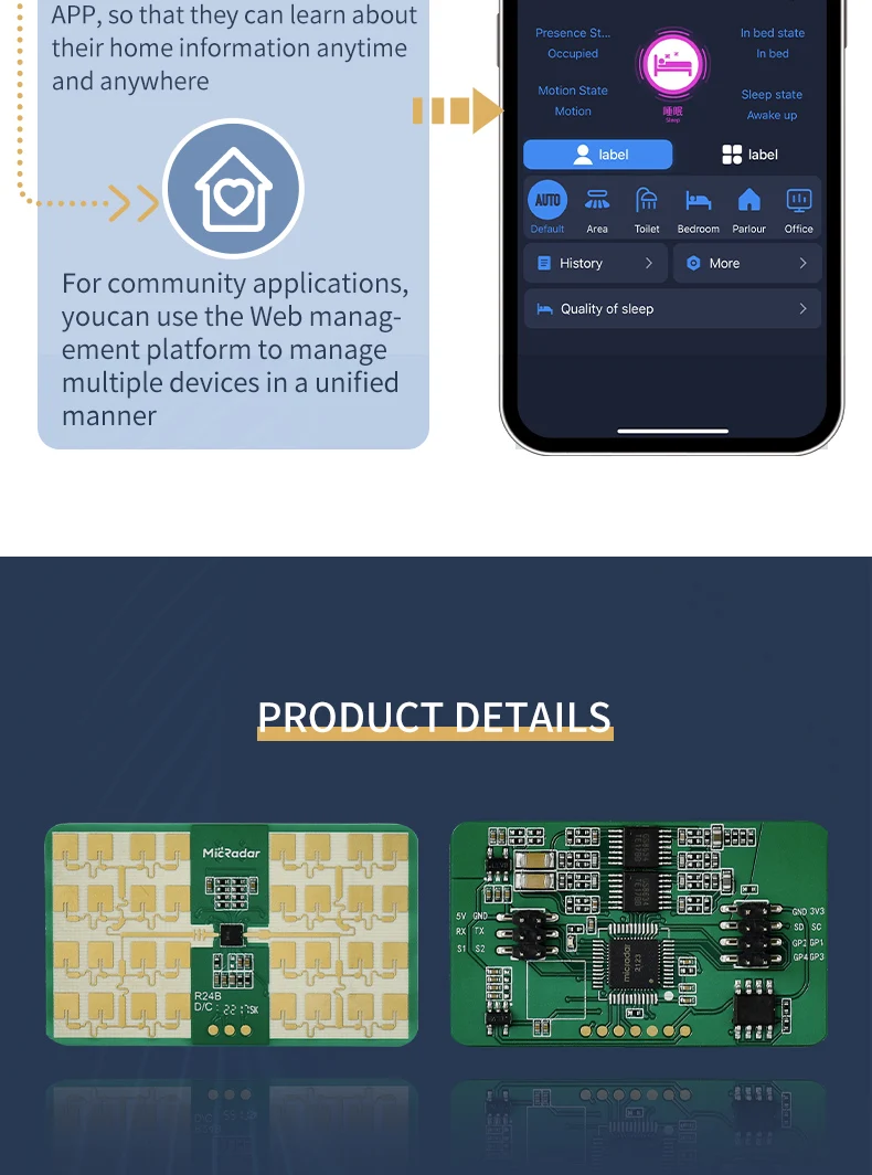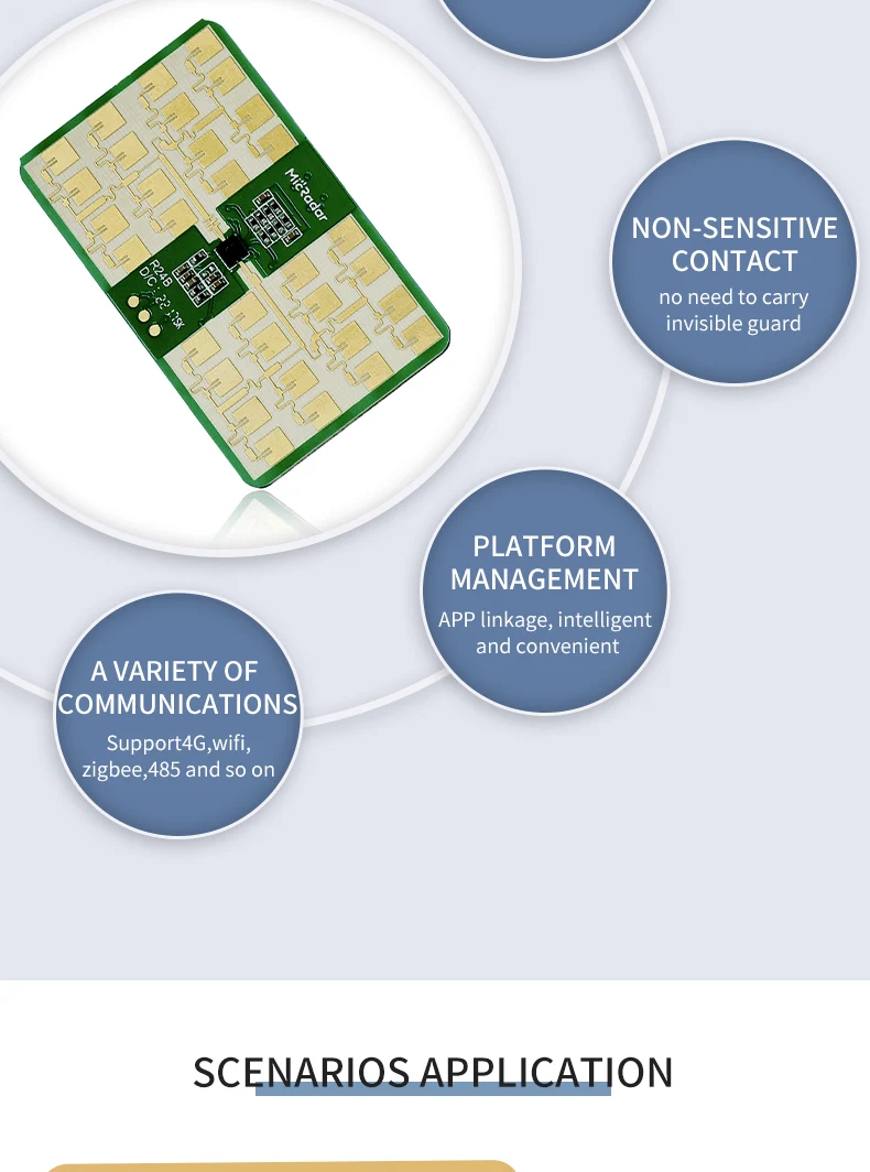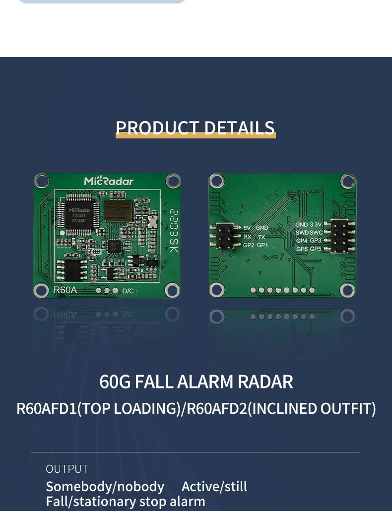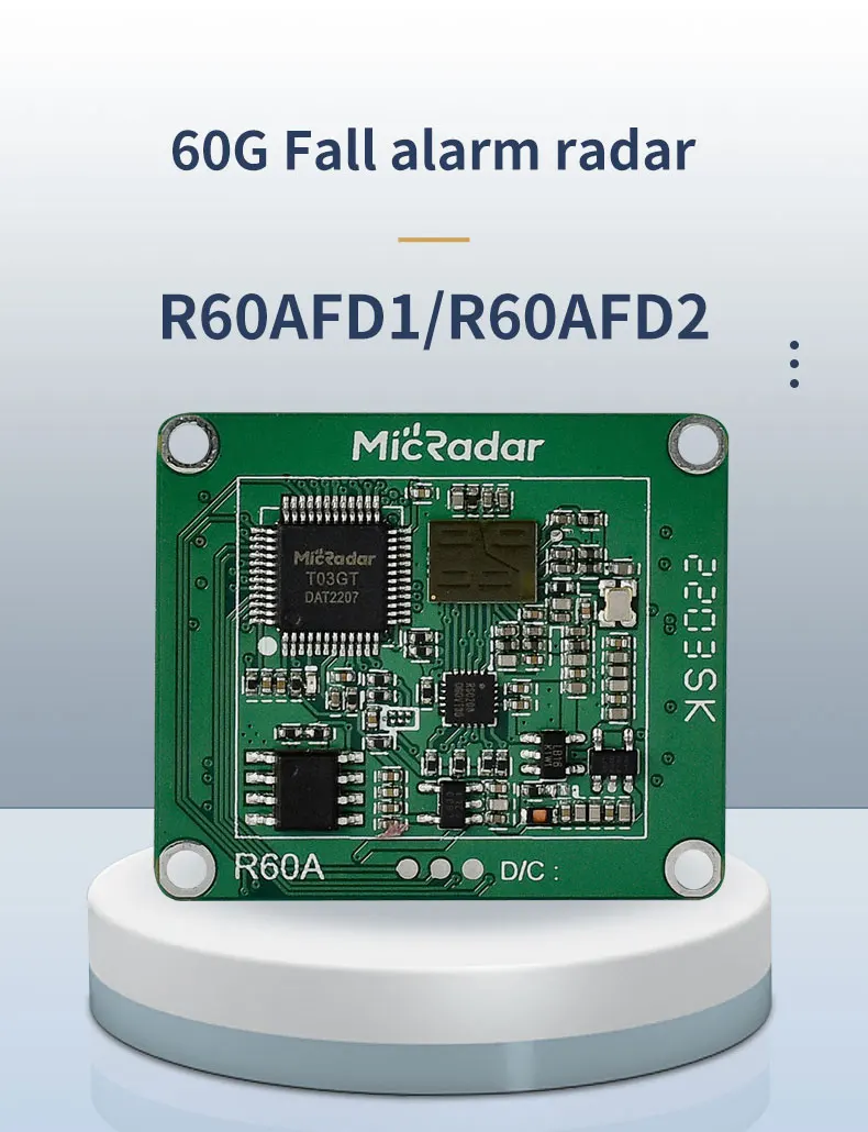 El módulo de radar R60ATR2 es una tecnología de radar de onda milimétrica de 60G, a través de la recopilación de información de dirección humana, distancia y salida en tiempo real de información de azimut humano.Y tenga una sensación precisa de criaturas estacionarias y en movimiento.