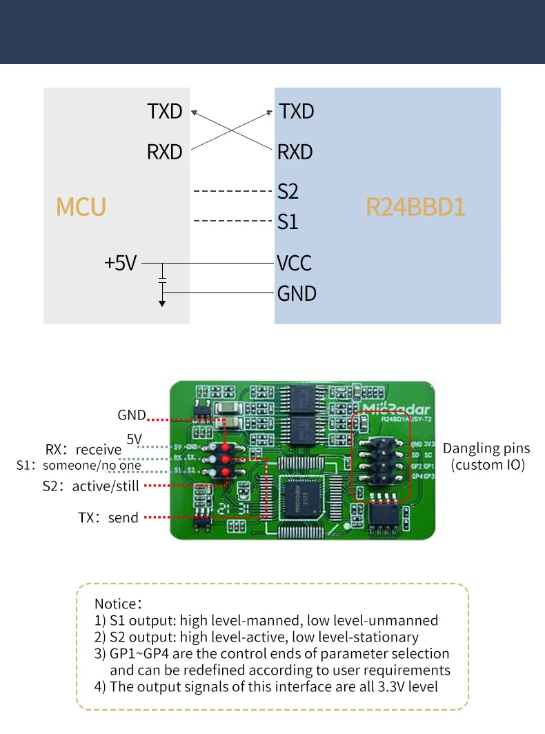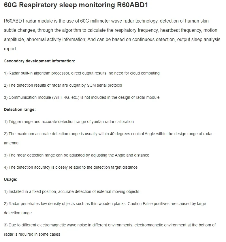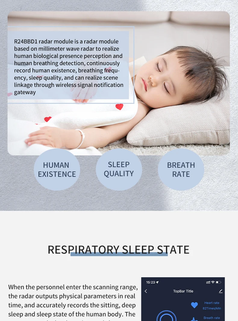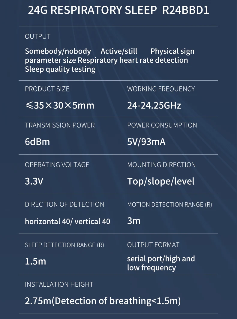 R24BBD1 24G Sensor de Radar de onda milimétrica Radar de monitoreo del sueño respiratorio Módulo de Radar de Biosensing de onda MM