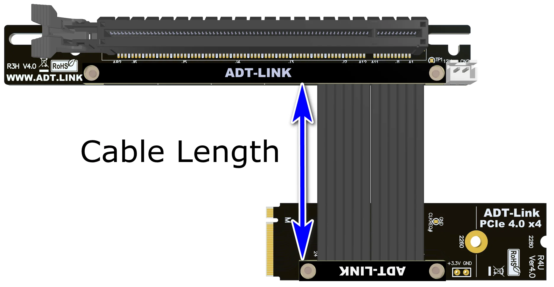 Nombre de la marca: adt-link Nombre del producto: M.2 NVMe key M a cable de extensión PCI-E X16 Modelo del producto: R43UF 4,0, R43UL 4,0, R43UH 4,0 Longitud del cable: 5 ~ 100mm, la longitud se puede personalizar Ancho de banda de velocidad: PCIe 4,0x4(gen4, 64G/bps) Accesorios del producto: cable adaptador de corriente SATA (debe estar conectado) Longitud del Cable Descripción: La longitud del cable se refiere a la parte del cable visible. No incluye la PCB ni el conector. Para la longitud del Cable, consulte la flecha del Cable en la figura a continuación.