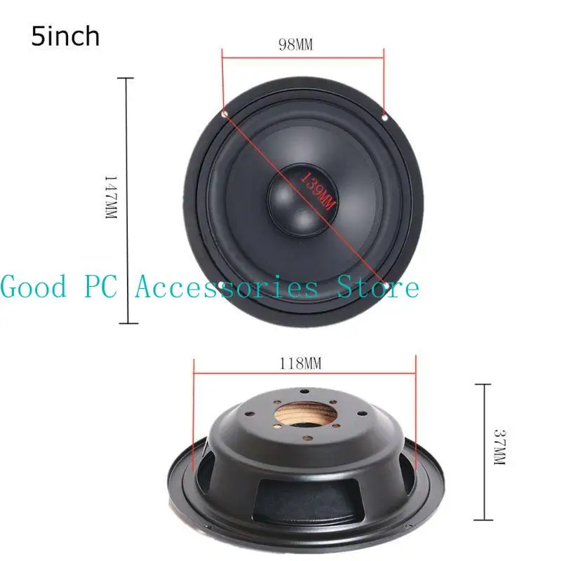 5 inch: horn diameter: 147mm/5.7in, diagonal twisting hole spacing: 139mm/5.4in, opening hole: 118mm/4.6in, counterbore depth+height: 3.8mm+37mm/0.14+1.4in