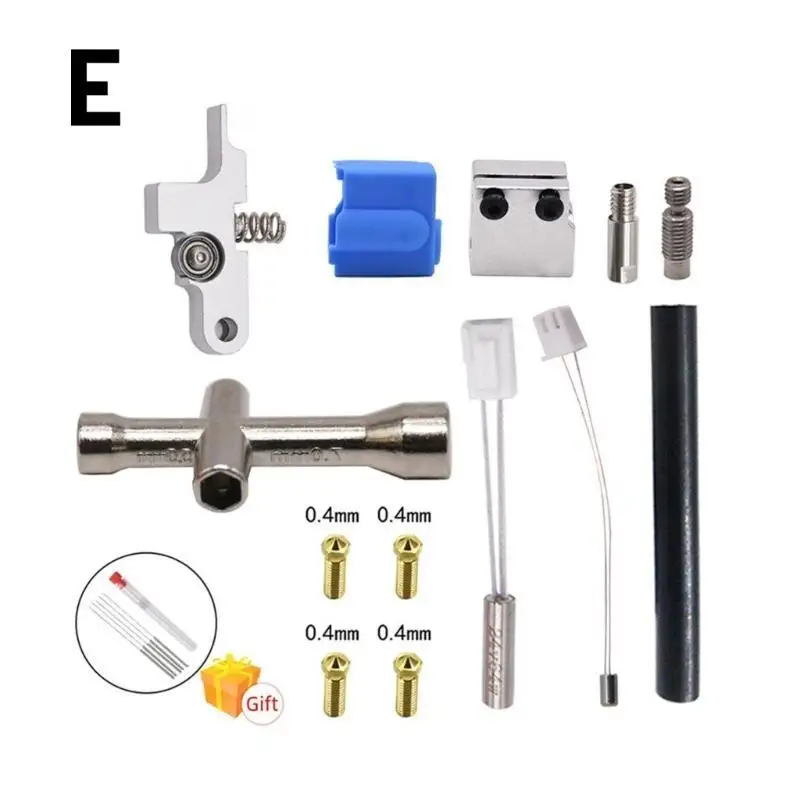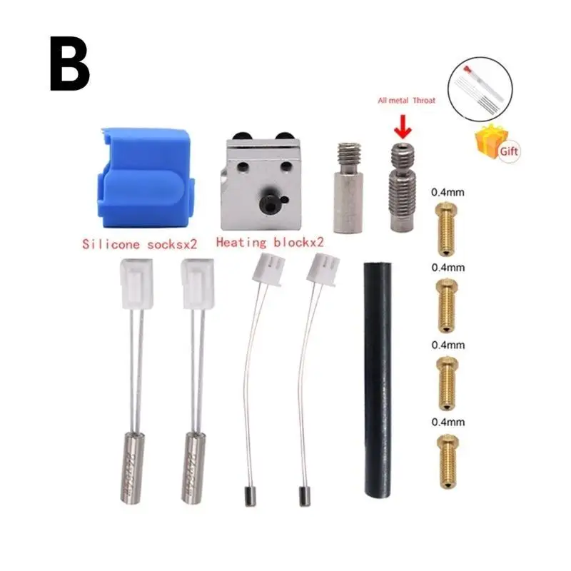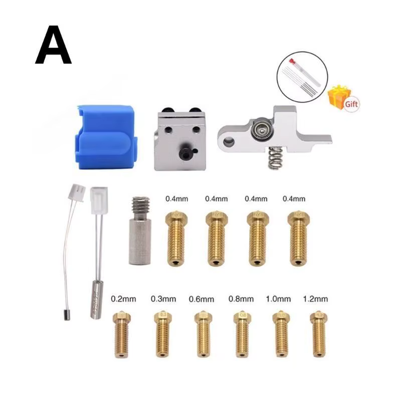 Type5 Set includes:4x0.4mm Nozzle,1xSilicone Case,1xHeating Block,1xHeater Thermistor,1xCleaning Needle,1xSocket Wrench,1xExtruder handle black,1xMetal Throat;