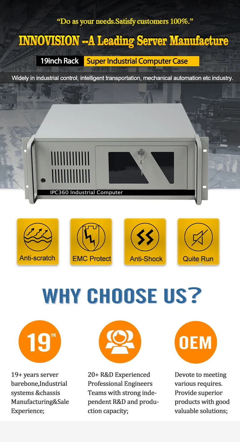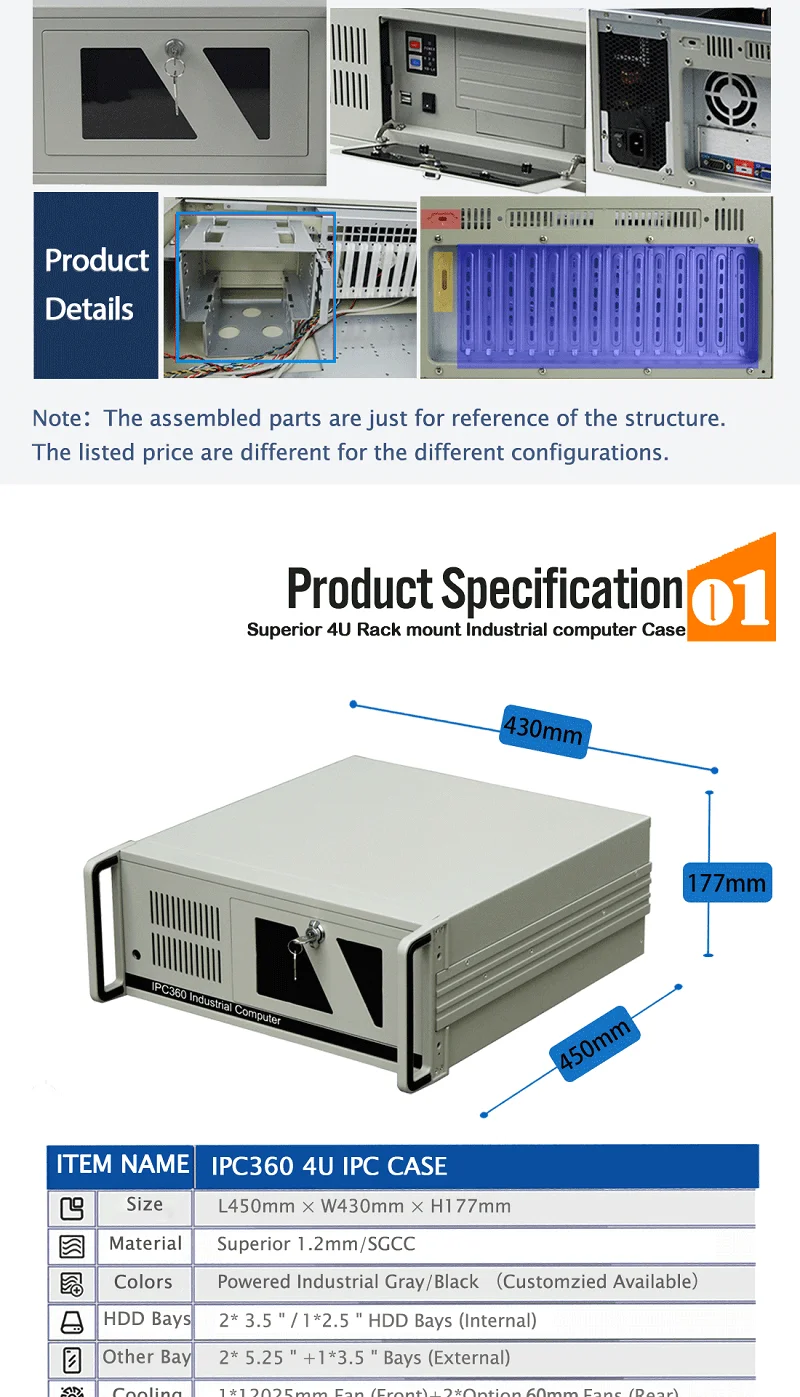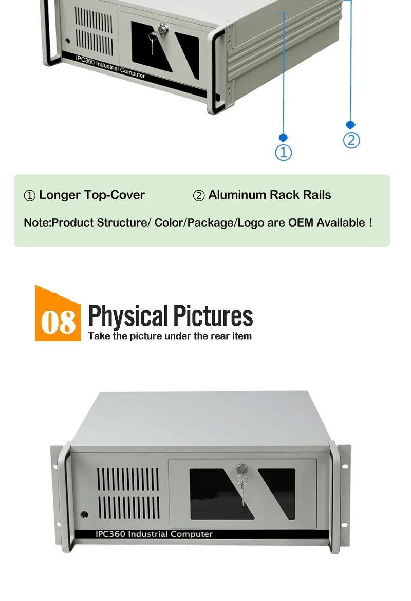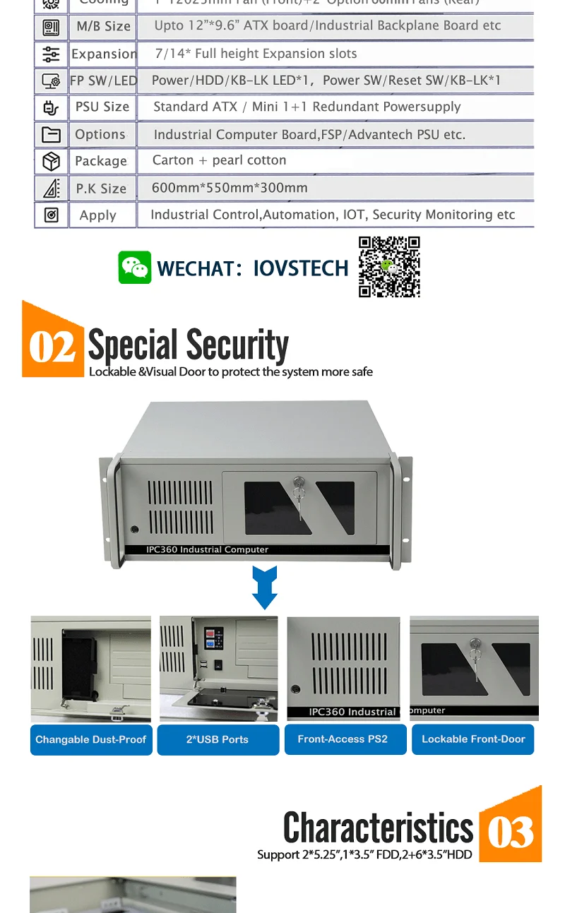 IPC360 es el clásico chasis de computadora industrial 4U rackmount. Soporta 3*5,25& 1*3,5 "controladores de disco externo con diseño antichoque de goma, mejoran el funcionamiento de los controladores de disco más estable. ¿Apoyo placa base ATX con 7 * de altura completa ranuras de expansión o panel posterior Industrial con 14 * ranuras de expansión? También es compatible con fuente de alimentación ATX o Mini fuente de alimentación redundante. Es una buena elección para elControl industrial, transporte inteligente, automatización mecánica, IOT, monitoreo de seguridad, etc.