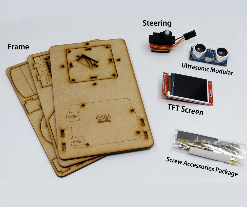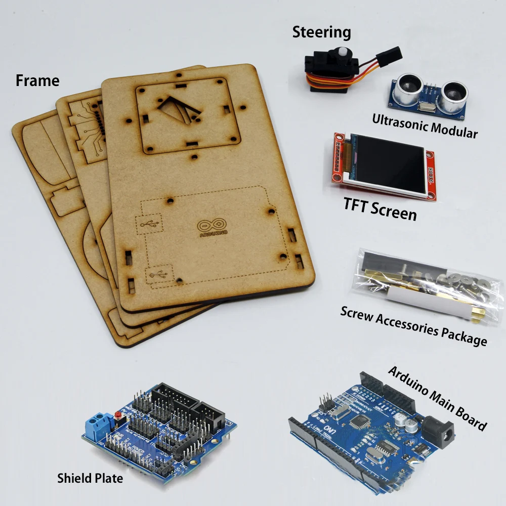 Configuración 1:1 * marco1 * Engranaje de dirección1 * Accesorios1 * Modular ultrasónico1 * pantalla1 * Paquete de accesorios de tornilloConfiguración 2:1 * marco1 * Engranaje de dirección1 * Accesorios1 * Modular ultrasónico1 * pantalla1 * Paquete de accesorios de tornillo1 * placa protectora1 * placa principal ArduioConfiguración 3:1 * marco