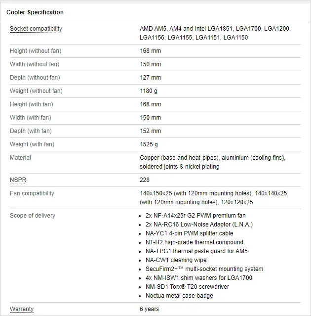 Gracias a la mayor densidad de las aletas posible gracias a los nuevos ventiladores NF-A14x25r G2, así como a las aletas-pilas asimétricas y a un espacio ligeramente más pequeño entre las pilas, la versión G2 combina un rendimiento mejorado con un tamaño ligeramente más pequeño en comparación con la NH original. D15 (profundidad del disipador de calor de 9 mm menos, el mismo ancho del disipador de calor, la misma altura total, incluidos los ventiladores).