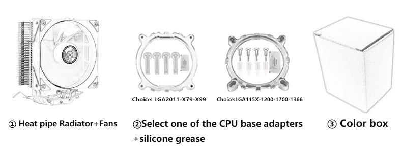 Paquete: Caja de color (refrigerador de CPU*1, soporte de fijación*1 kit, grasa de silicona*1)