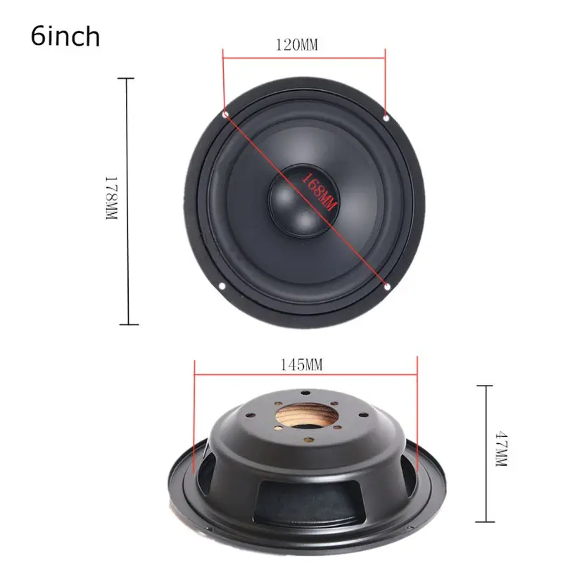 6,5 pulgadas: diámetro de la bocina: 178mm/7 pulgadas, espaciado del orificio de torsión diagonal: 168mm/6,6 pulgadas, orificio de apertura: 145mm/5,7 pulgadas, profundidad del avellanado + altura: 4mm + 47mm/0,15 + 1,8 pulgadas