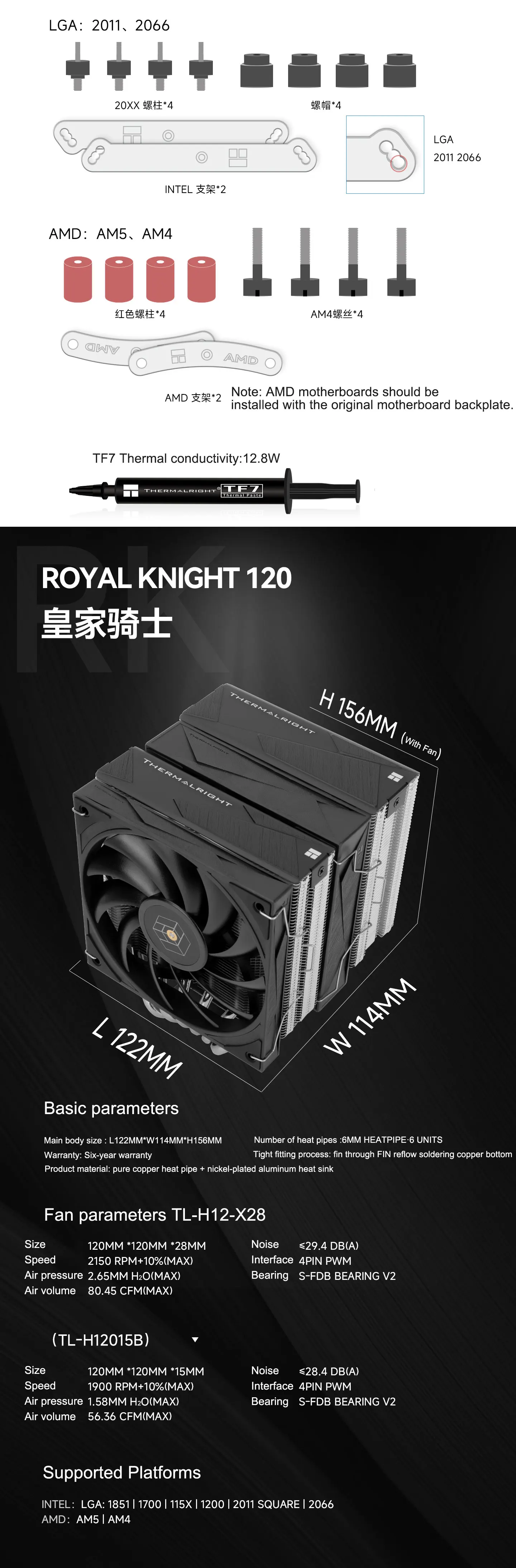 Radiador de refrigeración de aire para ordenador Thermalright Royal Knight 120, 6 tubos de calor y ventiladores duales, soporte para radiador de CPU LGA1700/115X/AM5/AM4