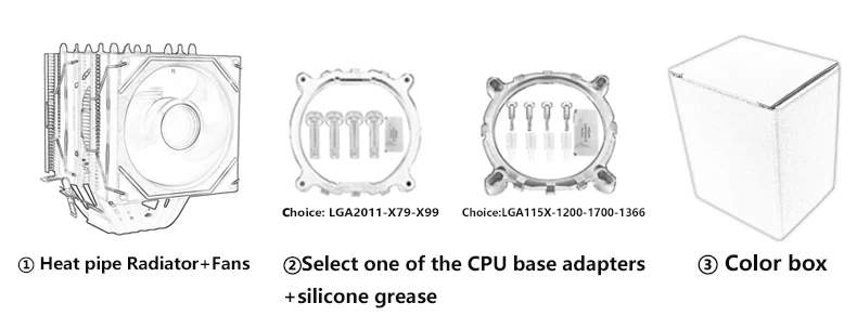 Paquete: Caja de color (refrigerador de CPU*1, soporte de fijación*2 kit, grasa de silicona*2)