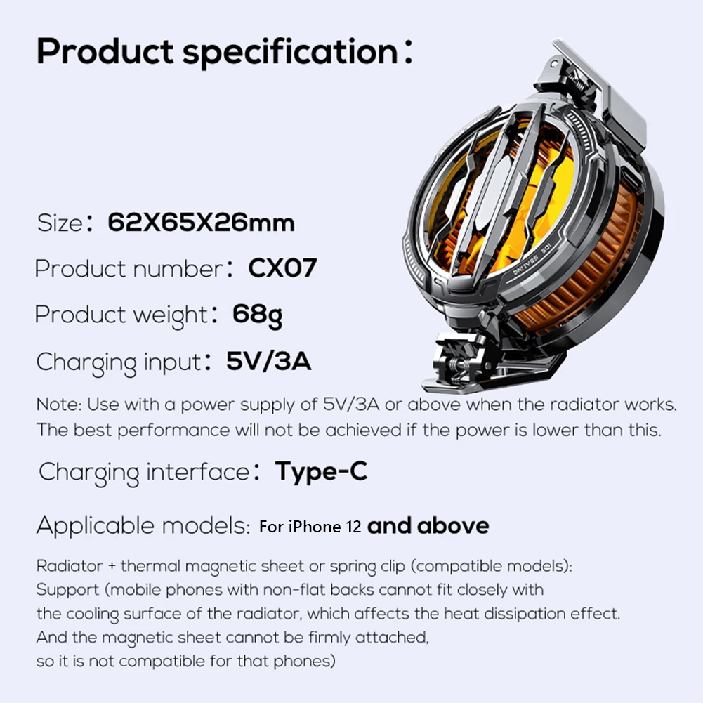 (*Si es un teléfono móvil con parte posterior no plana, no encajará perfectamente con la superficie de enfriamiento del radiador, lo que afectará el efecto de disipación de calor, y la lámina magnética no se puede fijar firmemente, por lo que no es compatible)