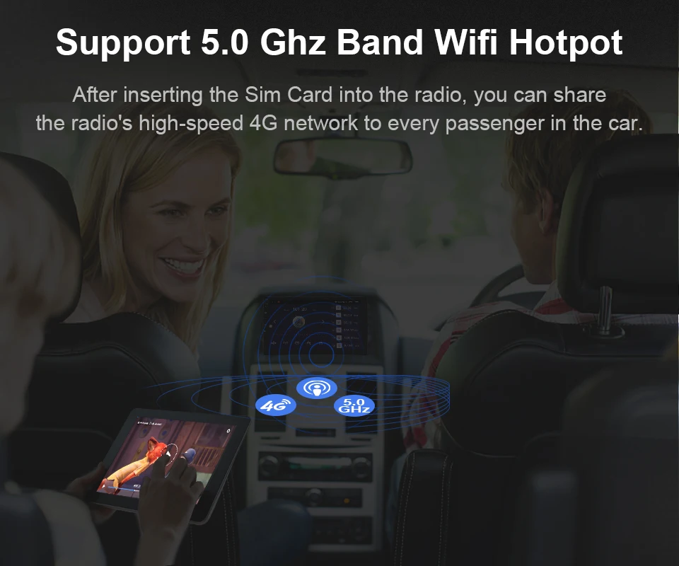 Soporte 5,0 Ghz banda WIFI HotpotDespués de insertar la tarjeta SIM en la radio, puede compartir la red 4G de alta velocidad de la radio con cada pasajero en el automóvil.