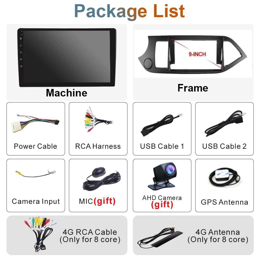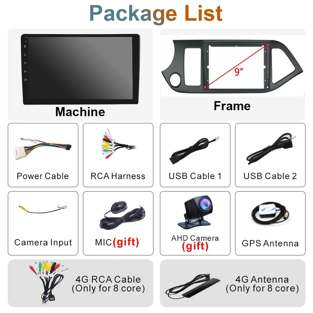 9 Pulgadas de Radio Del Coche Android todo en uno Auto Estéreo Para KIA PICANTO Mañana 2011-2016 Multimedia Reproductor de Vídeo de Pantalla Táctil Carplay 2 Din Unidad Principal GPS Wifi 4G