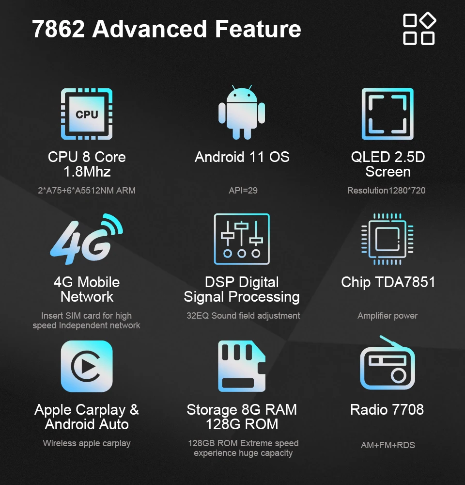 Pantalla de 2.5D QLED, disfrute visualResolución de la versión de 8 núcleos: 1280*720p, ángulo de visión completa. En comparación con la pantalla TFT normal, la pantalla OLED integró una capa de cristal de punto cuántico, que puede proporcionar un mejor brillo y un espectro de color más amplio.