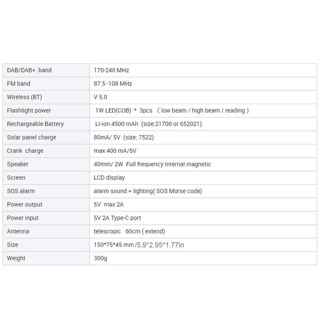Linterna: Esta radio también puede emitir luz brillante y puede mejorar la seguridad de caminar de noche o viajar.