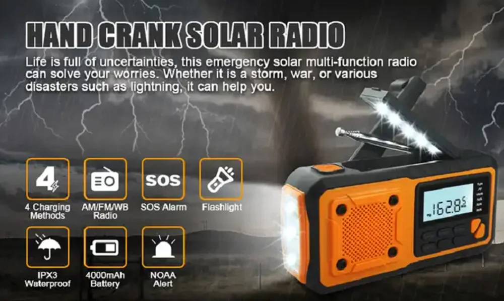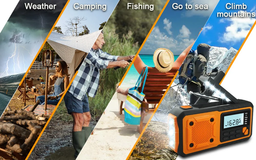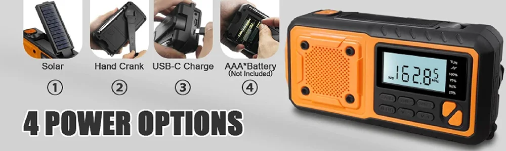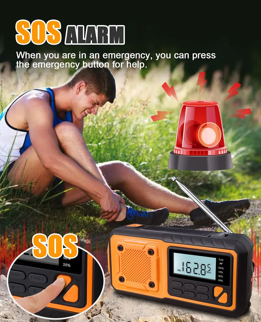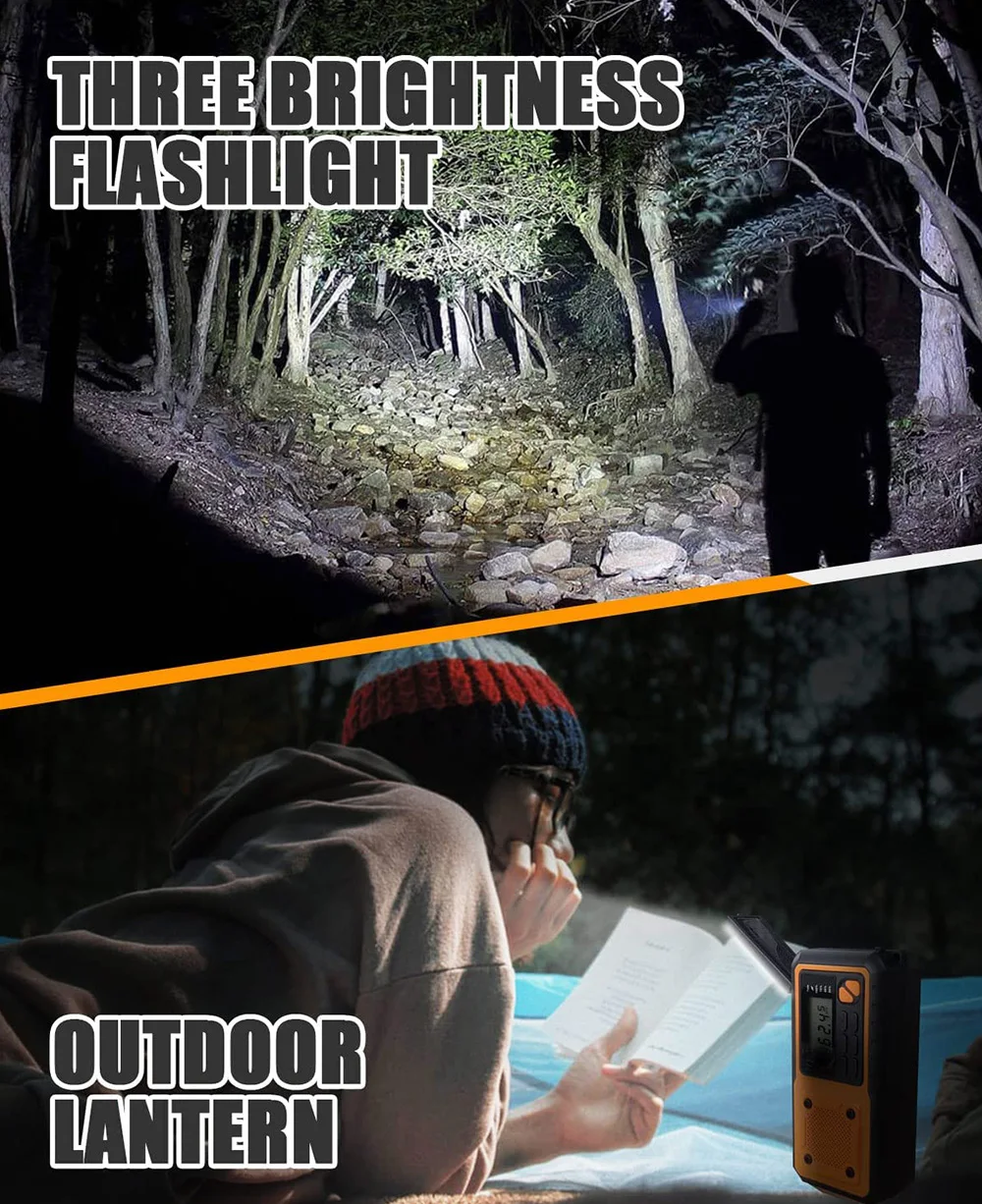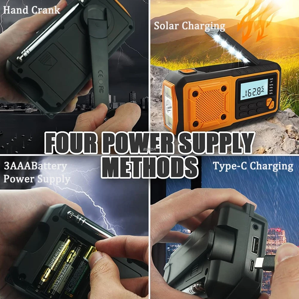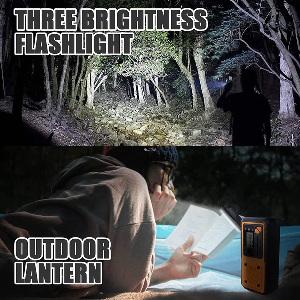 1. Strong Signal: Weather alert will sound a siren, and a red flash will notify of life-threatening weather, winning critical time to keep your family away from dangers. Receive a strong signal even in places with poor signal.2. Super Bright: This radio has a super loud alarm and flashing red light to attack attention in time and be rescued. Flashlight provides highlights continuously; more available. Waterproof essential suit for casual camping, backpacking, wild survival.3. Four Power Supply Methods: You can use type-c cable to charge the radio at ordinary times. However, in case of emergency, power failure may occur. At this time, the hand generator, solar panel and AAA dry battery backup (provided by the customer, not included in the product) can charge the radio. The built-in rechargeable battery can provide radio or lighting work, or charge other devices, such as mobile phones, GPS, etc.4. With Flashlight: Radio has multi-function, not only can send out distress signals, receive information, but also with a flashlight, when necessary, the flashlight mode can be turned on to illuminate the night. Can be charged by solar and hand crank.Specification:Material: PlasticSize:21*6*9.7CMColor: OrangeNote:1. In manual measurement, the size will have an error of 0.5-2mm, please refer to the actual size.2. Due to the difference in light and screen, the color of the product may be slightly different from the picture. Please take the real one as standard.Please understand, thank you!
