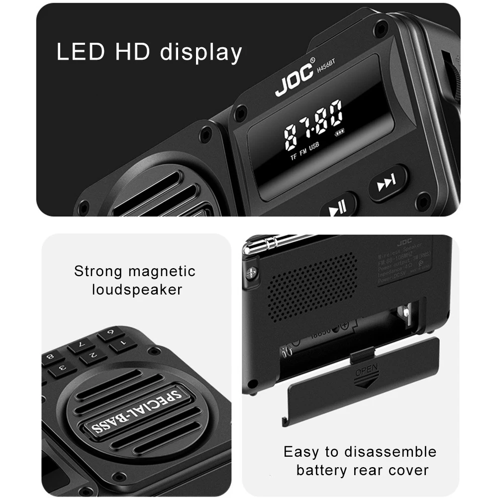 1.Capacidades de audio integrales:Esta versátil radio FM portátil 4 en 1 integra radio FM, altavoz BT, tarjeta TF y reproducción USB, junto con un conector para auriculares de 3,5 mm, que satisface todas sus necesidades de audio.Perfecto para cualquier ocasión, ofrece una calidad musical superior ya sea en casa, mientras viaja o en reuniones sociales.