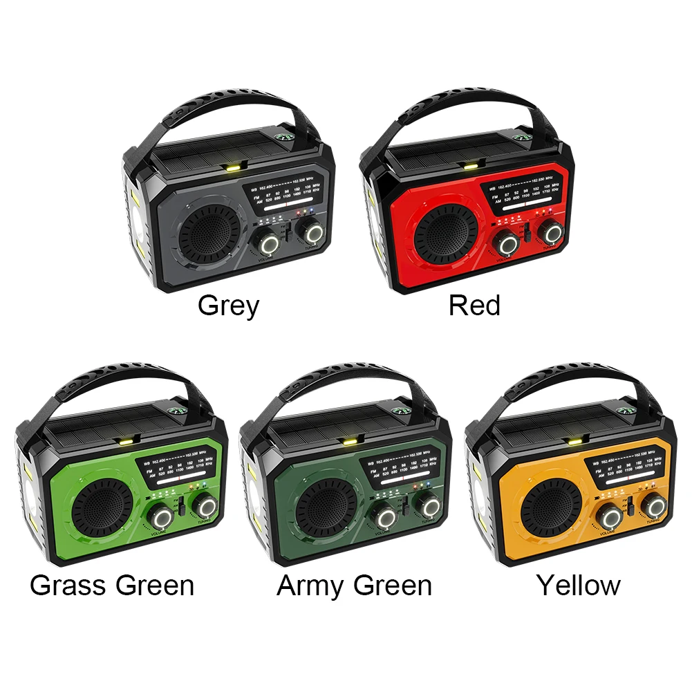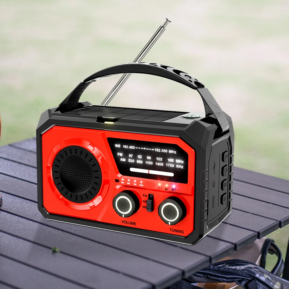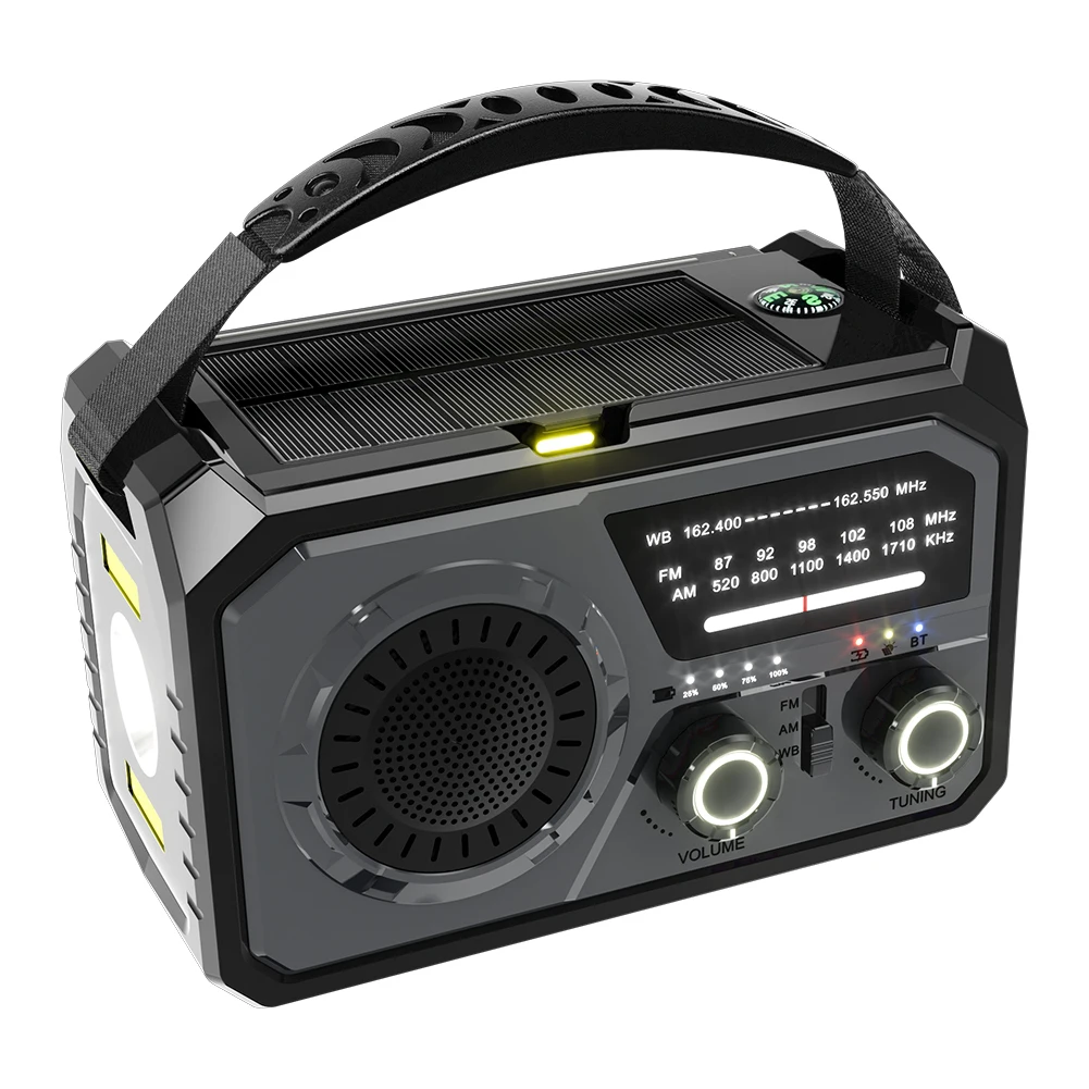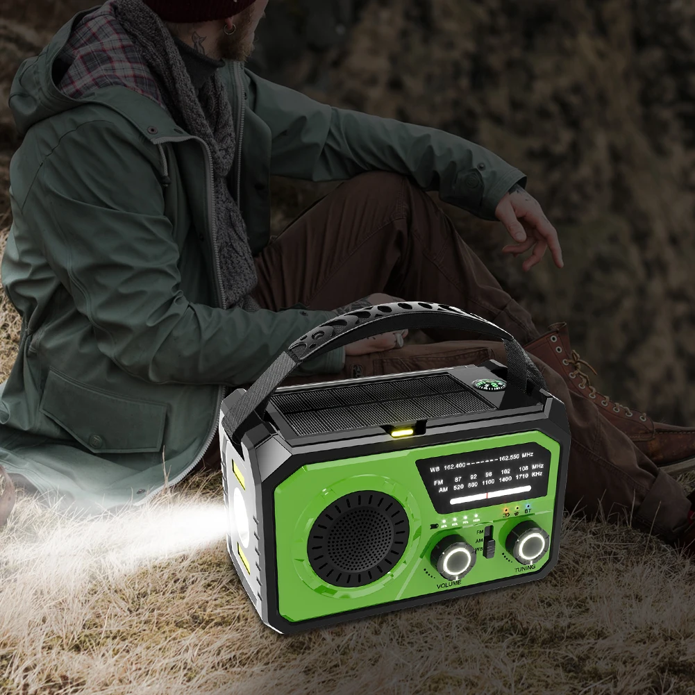 4.Características multifuncionales:Esta Radio Multifuncional ofrece múltiples opciones de carga (manivela, solar, USB3A), un Compatible con BluetoothCapacidades de altavoz, alarma SOS, brújula y banco de energía.Incluye una linterna de emergencia/luz LED para iluminar la noche o ayudar en la lectura.