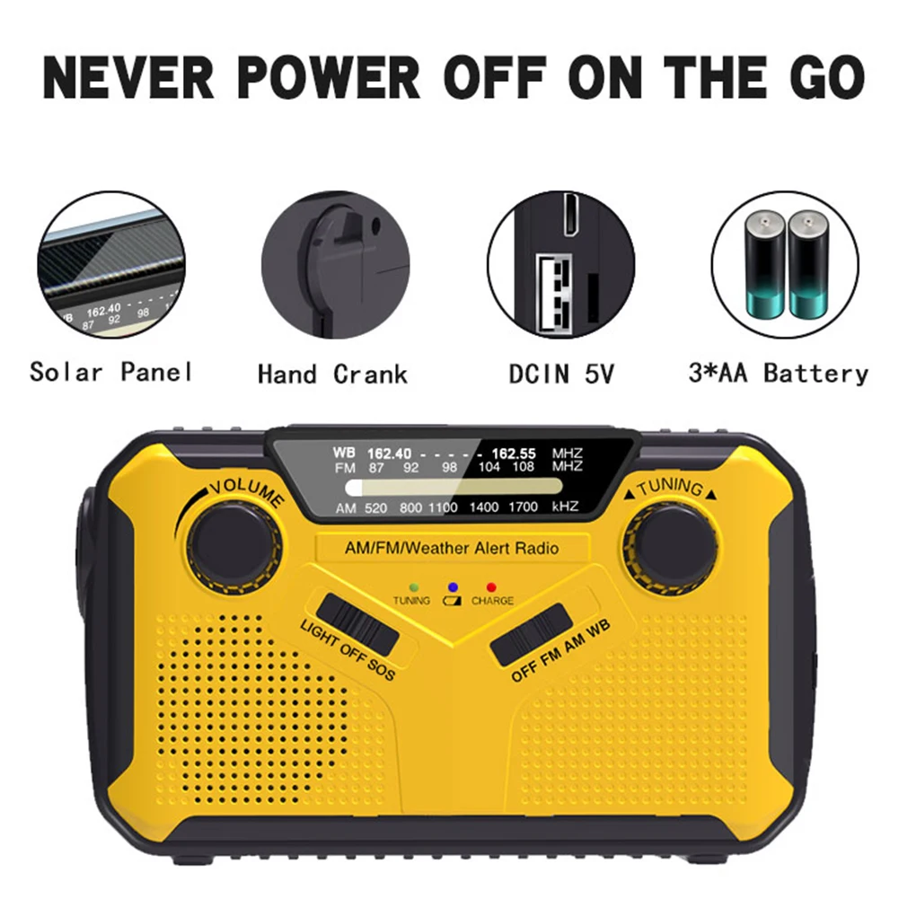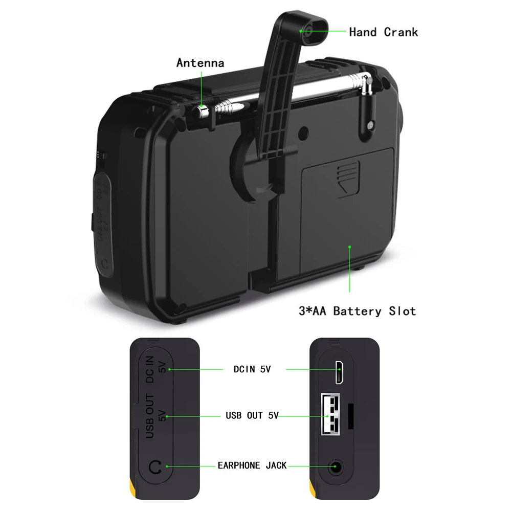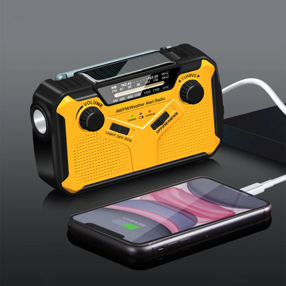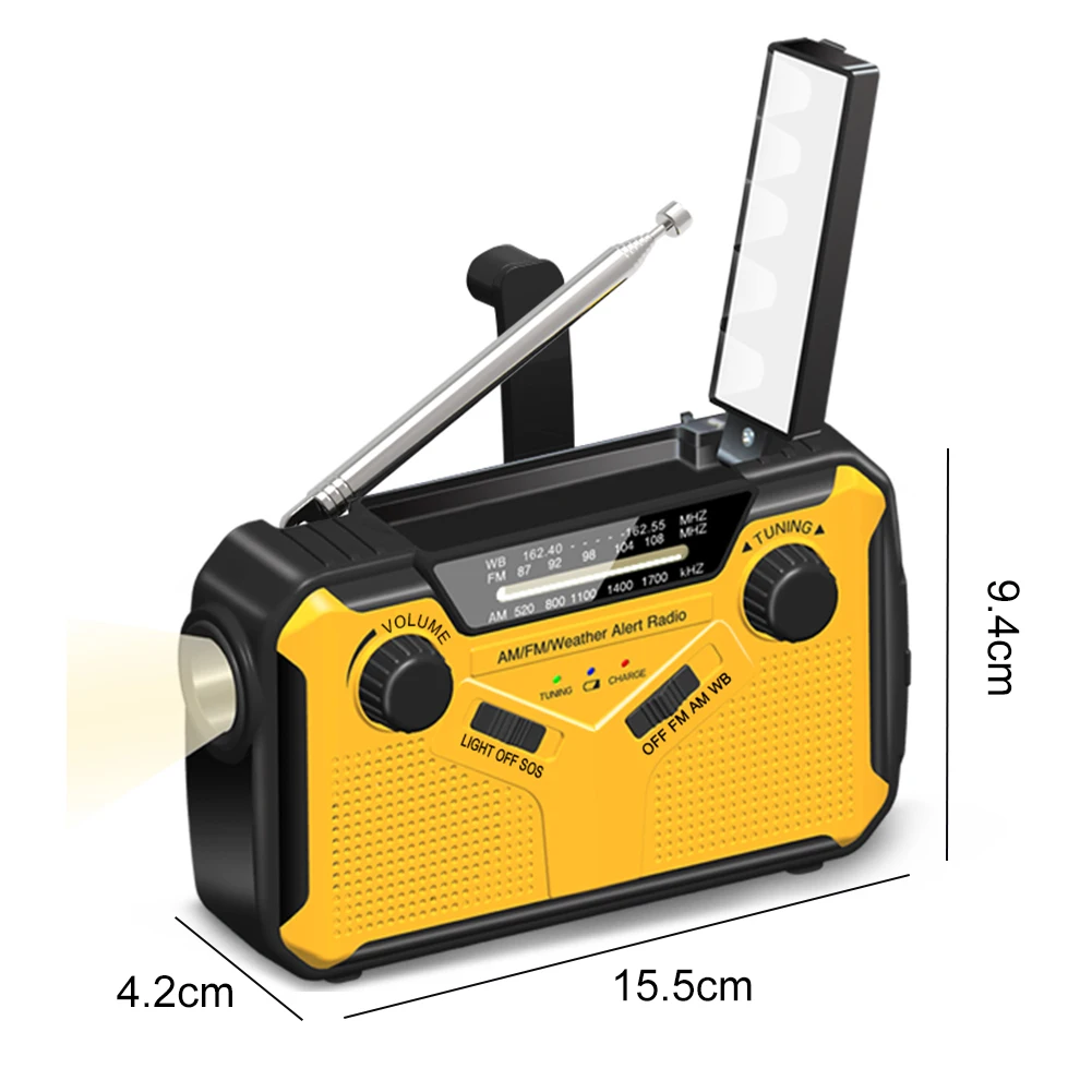 2. Soluciones de energía adaptables:Esta radio de manivela manual proporciona cuatro opciones de carga, solar, manivela, batería de litio USB y baterías secas, asegurando que su dispositivo permanezca encendido bajo cualquier circunstancia. Es ideal para viajes largos o cortes de energía inesperados.