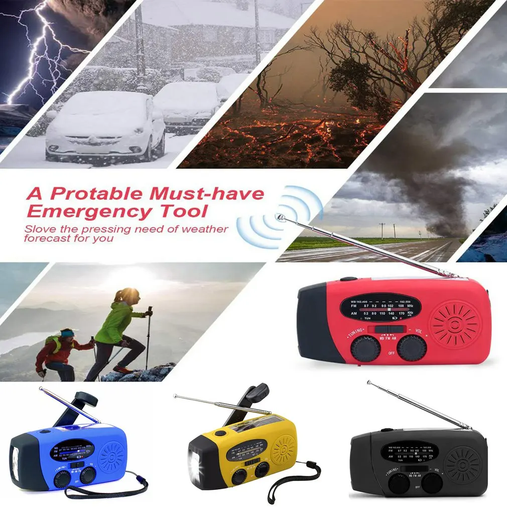 Radio Solar portátil manivela de mano Dinamo alimentada AM/FM/NOAA Radio Meteorológica rescate de emergencia linterna LED carga USB de energía móvil