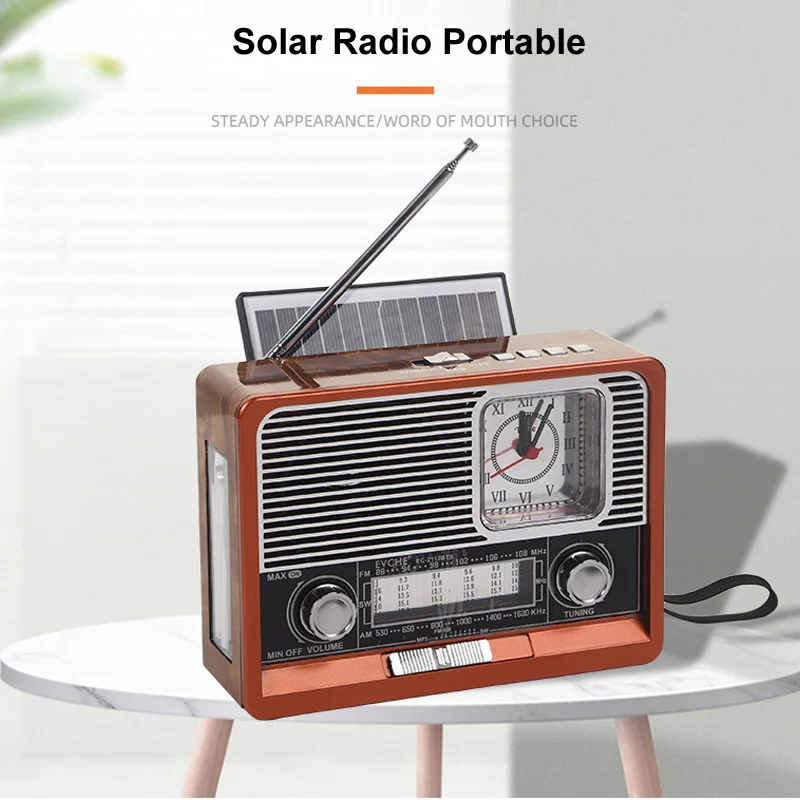 Comprar Radio Solar Retro con Bluetooth, reproductor de música MP3, luz LED, linterna, reloj, USB, tarjeta TF, cargador auxiliar