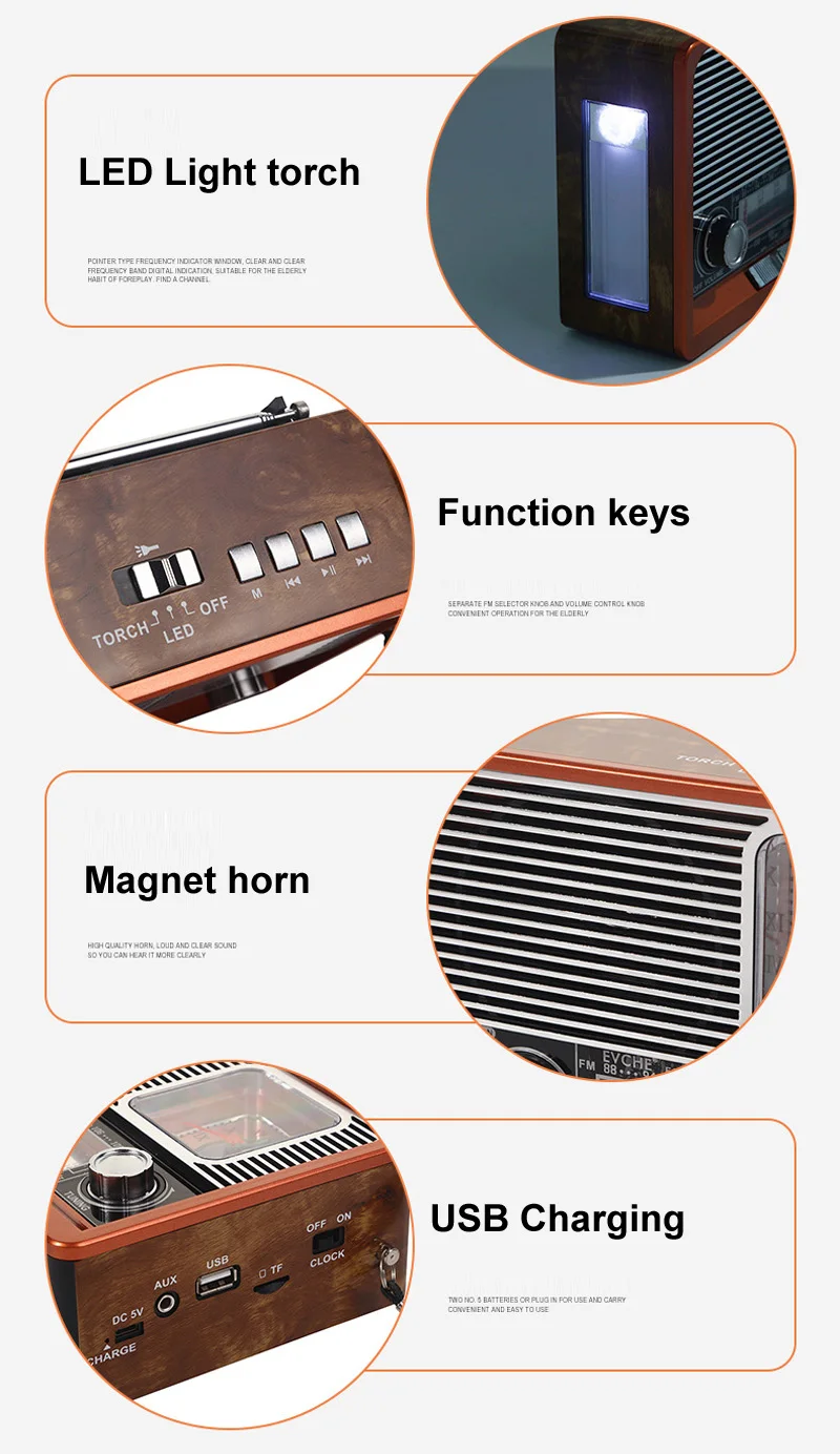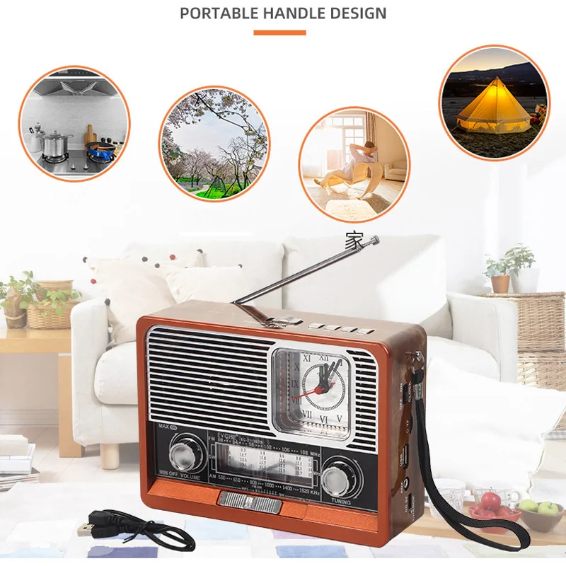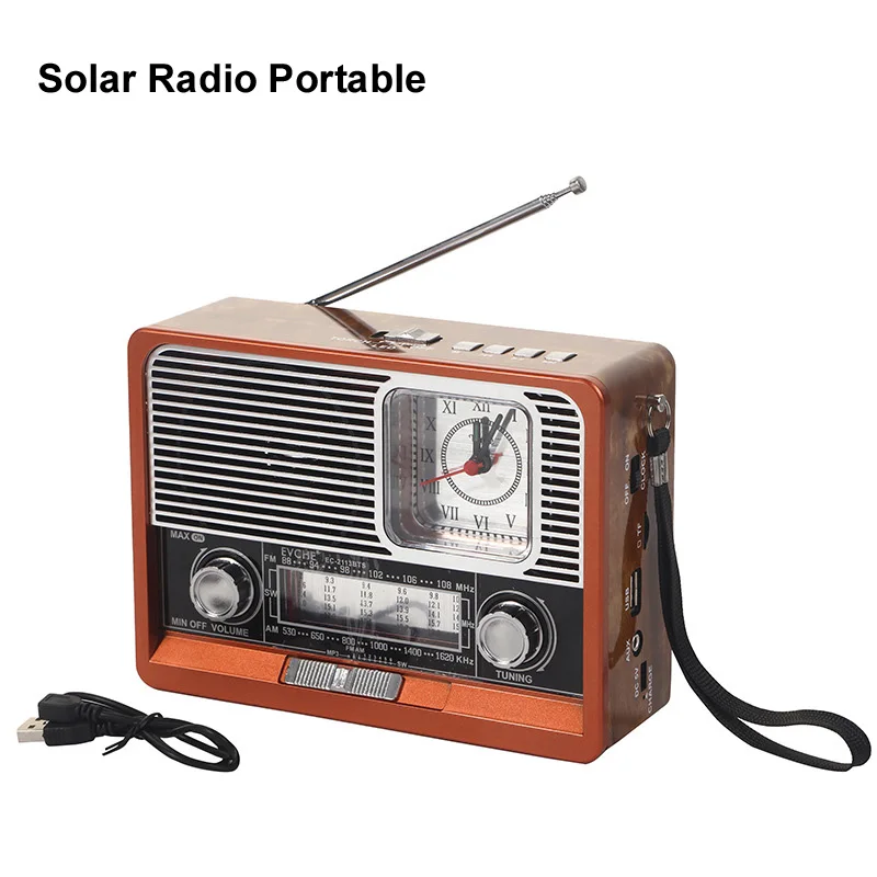 Comprar Radio Solar Retro con Bluetooth, reproductor de música MP3, luz LED, linterna, reloj, USB, tarjeta TF, cargador auxiliar
