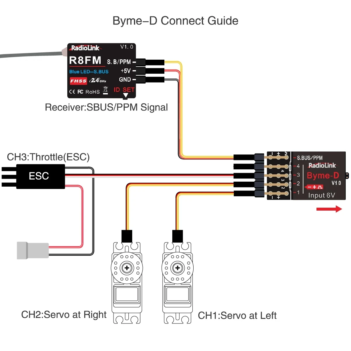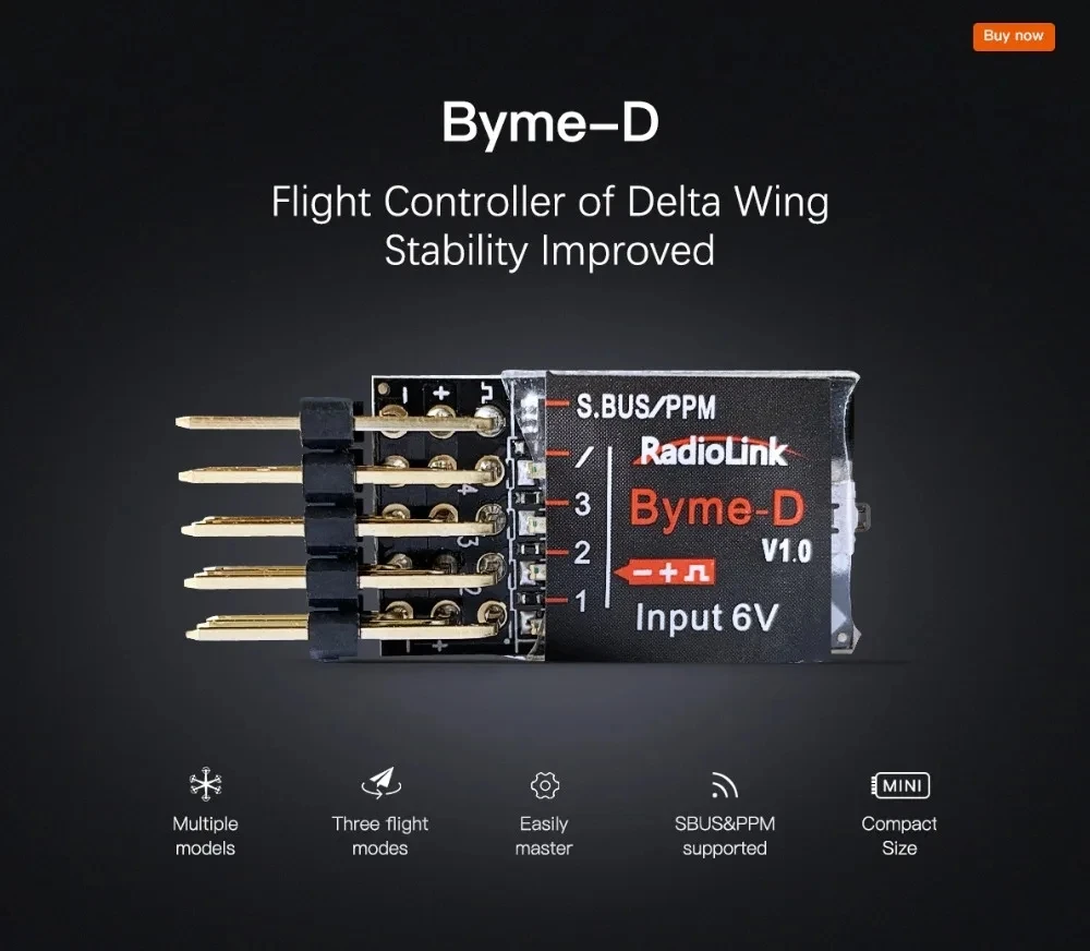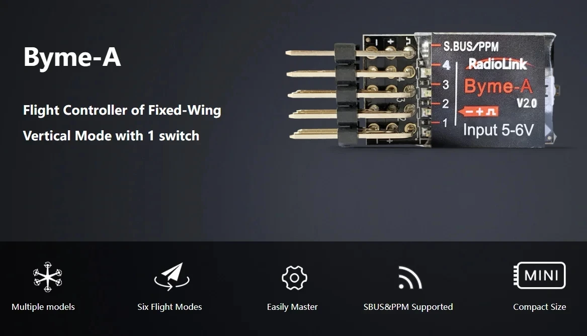 El Byme A es un excelente controlador de vuelo para aviones de ala fija que se comunica a través de S-Bus, ya sea con receptores Radiolink o FlySky como FS-iA6B con firmware reciente.
