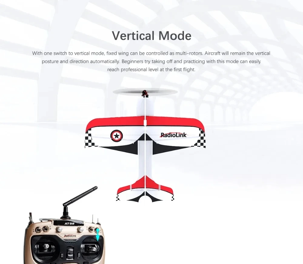 【Modo vertical con 1 interruptor】--Con un interruptor al modo vertical, el ala fija se puede controlar como multirotores.La aeronave seguirá siendo la postura vertical y la dirección automáticamente.