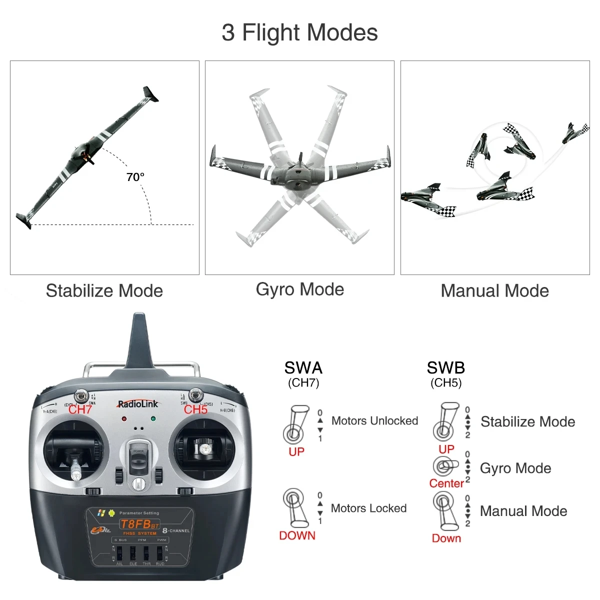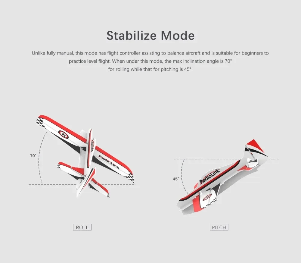 【Modo de estabilización】--Este modo tiene un controlador de vuelo que ayuda a equilibrar los aviones y es adecuado para que los principiantes practiquen el vuelo nivelado.Cuando está en este modo, el ángulo máximo de inclinación es 70° para rodar mientras que para lanzar es 45°.
