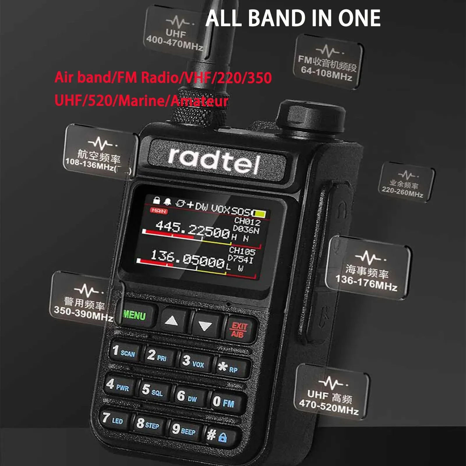 Comprar Radtel-RT-890 de banda completa, Radio Amateur de 2 vías, 999CH, walkie-talkie AM Air, escáner a Color, escaneo marino NOAA