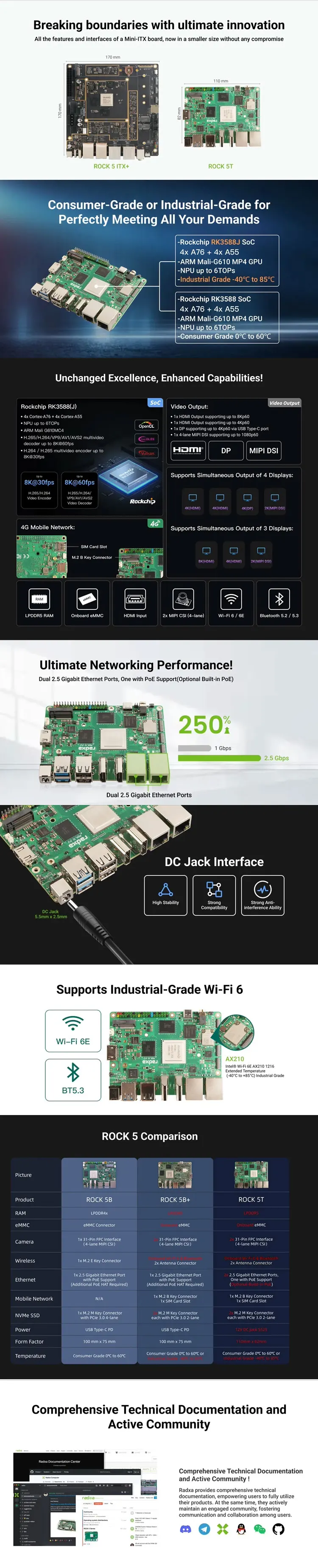 Radxa Radxa ROCK 5T RK3588,rockchip, CPU de 8 núcleos Puertos Ethernet duales de 2,5G LPDDR5 Grado industrial
