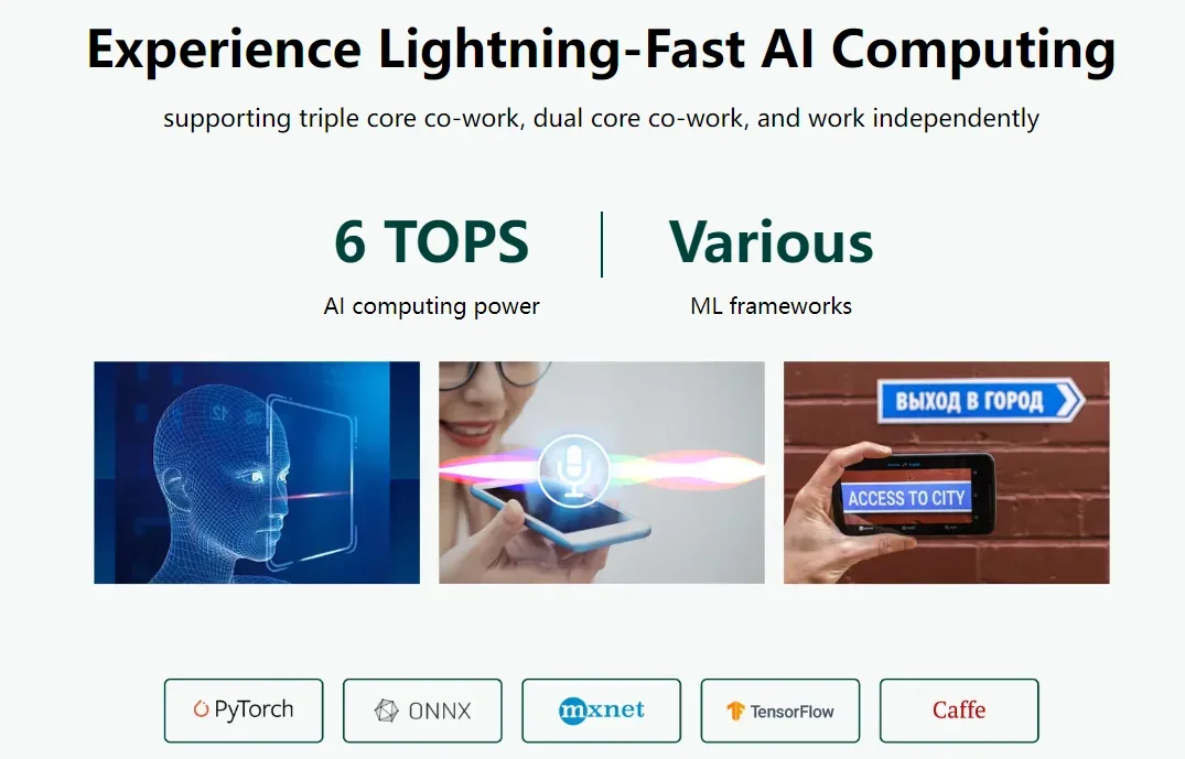 Armar Mali™ GPU G610MC4 compatible con OpenGL® ES1.1, ES2.0 y ES3.2, OpenCL® 1.1, 1,2 y 2.2, Vúl® 1.1 y 1.2, módulo de aceleración de imagen 2D integrado de alto rendimiento