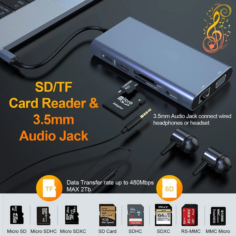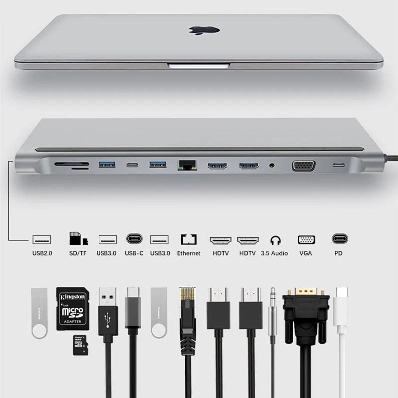 Modelo 4: Tipo-C a HDTV/VGA/RJ45/SD/TF/Tipo-C/USB 3,0/USB 2,0*3/Aux;
