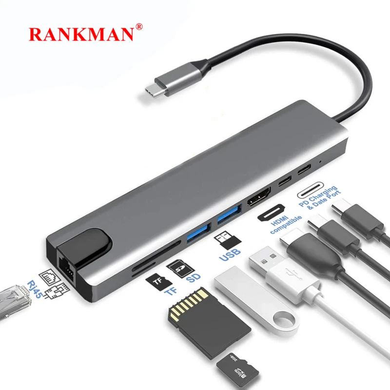 Comprar Rankman-Hub USB C a RJ45 Ethernet, 4K, HDMI, Compatible con USB 3,0, 2,0, tipo C, carga SD, TF Dock para MacBook, Samsung S21, Dex, HDTV