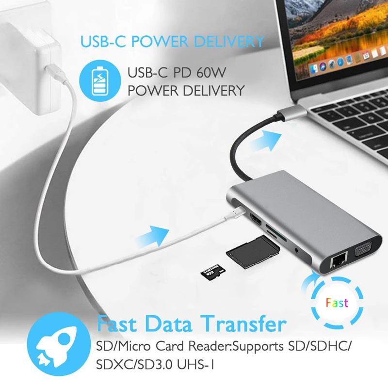 Comprar Rankman-Hub USB tipo C a RJ45 4K, Compatible con HDMI, VGA, SD, TF, USB 3,0, 2,0 PD, para MacBook, iPad, Samsung S21, Dex, PS5, Nintendo
