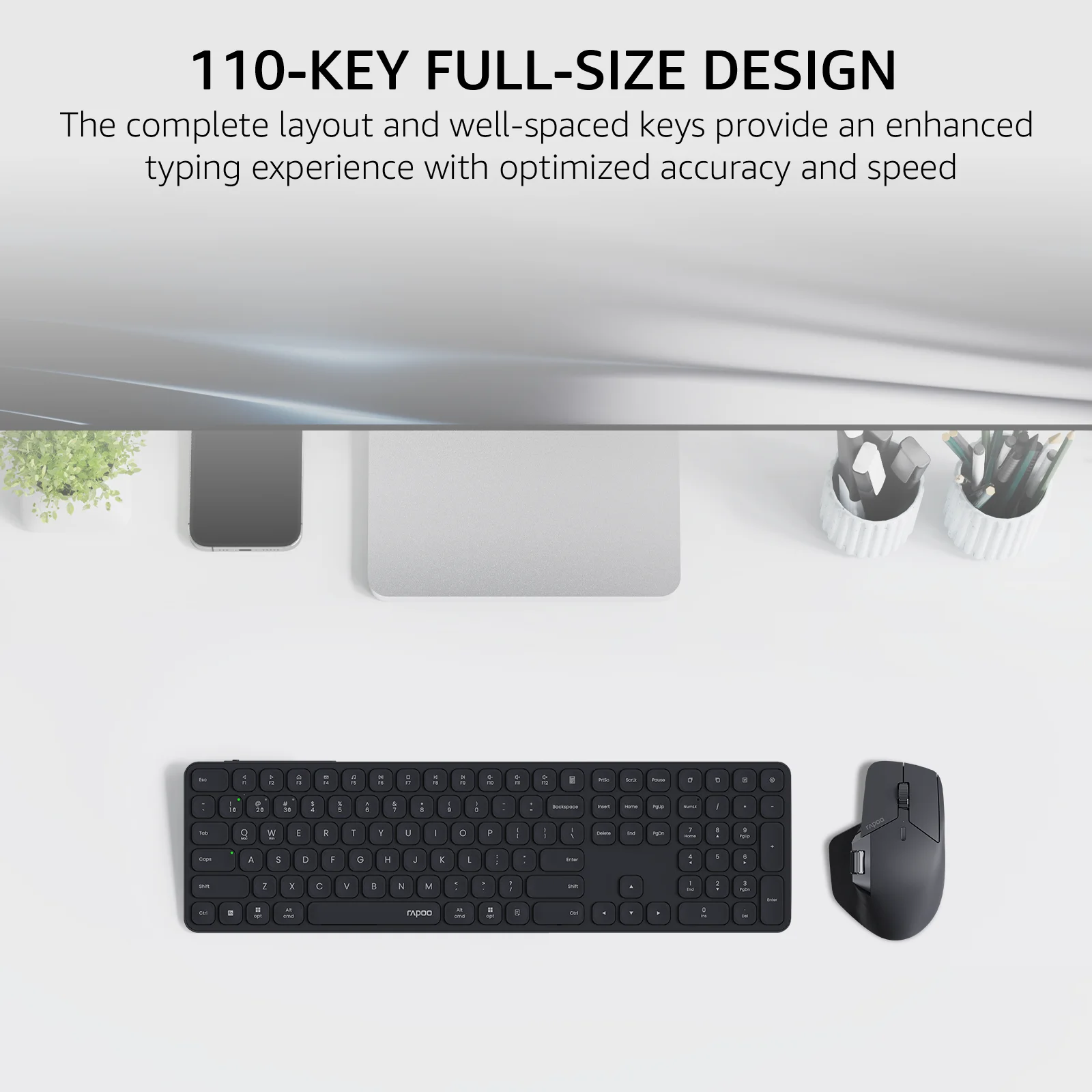 Silencioso y cómodo: con el clásico teclado ultrafino E9550L de la serie Blade de RAPOO y el mouse ergonómico MT760SE, este combo ofrece una experiencia de escritura y clic fluida, precisa y silenciosa.El teclado ultrafino de 0,2 pulgadas proporciona un ángulo de escritura natural para su muñeca (el reposamanos ya no es necesario) y el mouse ergonómico reduce la tensión en las manos durante las horas de trabajo intensas.