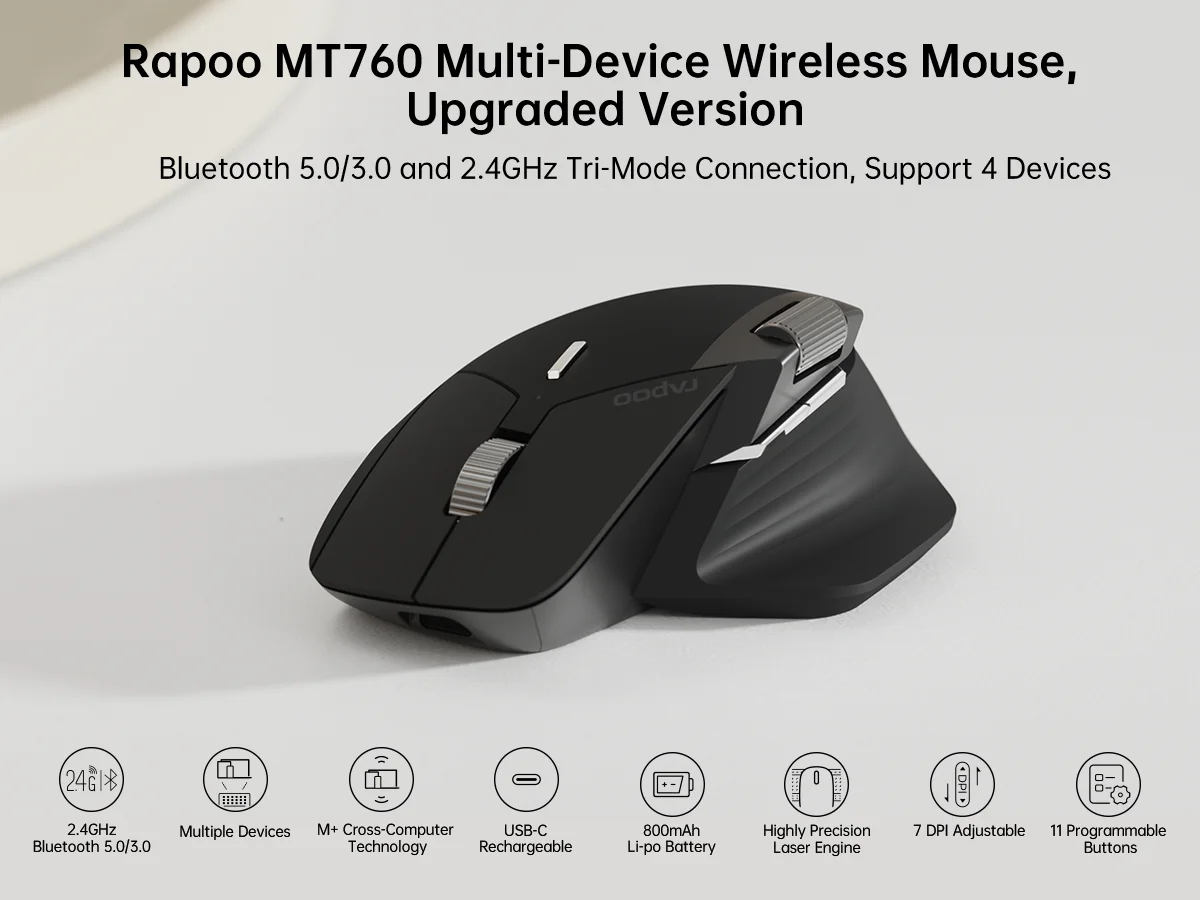 Rapoo MT760 Multi-Device Wireless Mouse Bluetooth Computer Mouse 11 Programmable Buttons 90 Days Battery Life