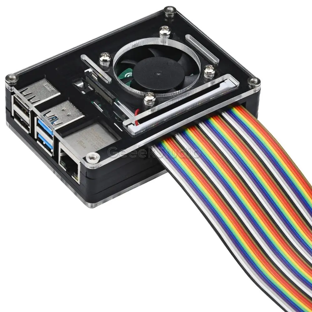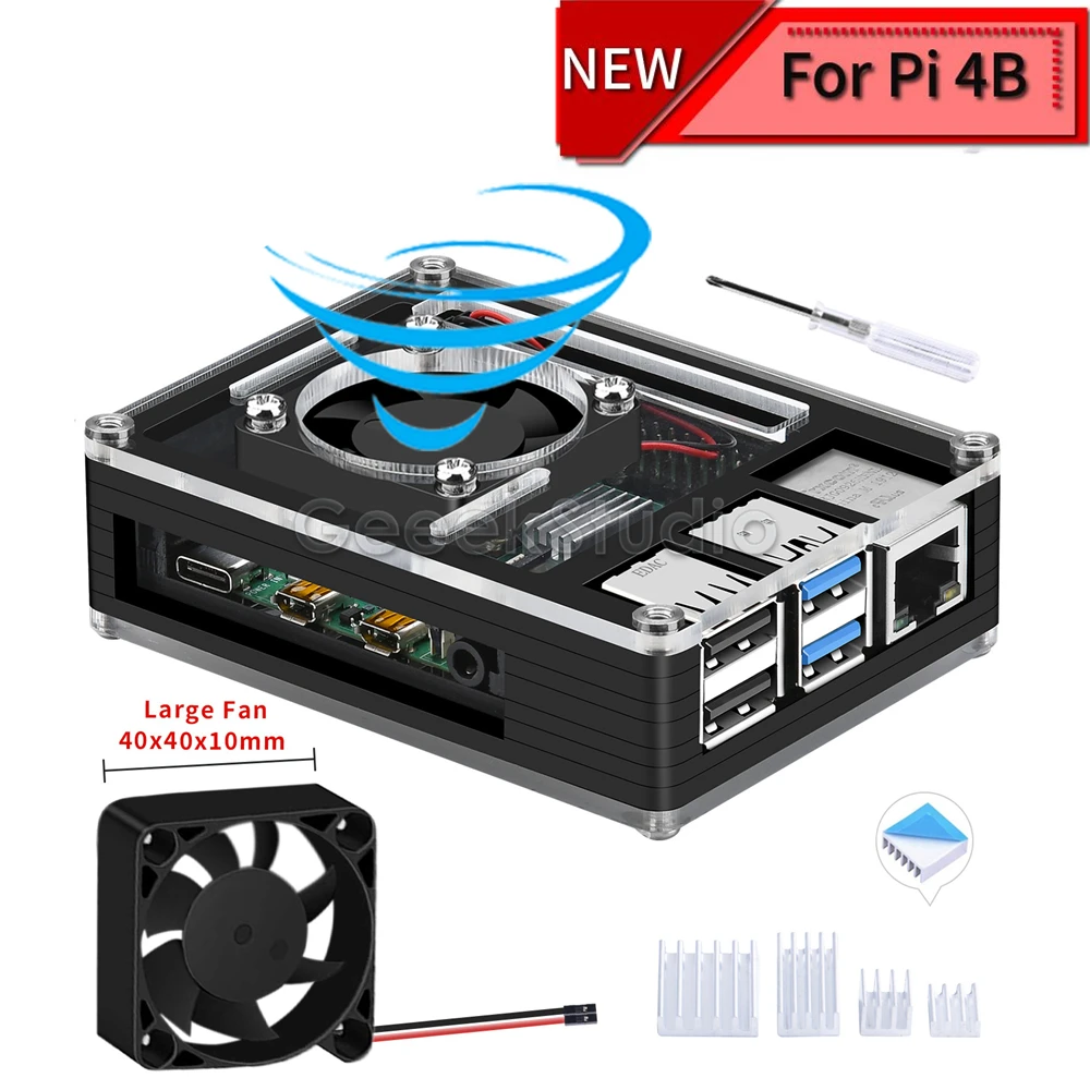Comprar Rasberry Pi 4B-carcasa negra de plástico acrílico con ventilador de refrigeración de gran tamaño 4010 para RPI 4 Modelo B, carcasa de cierre con disipador térmico